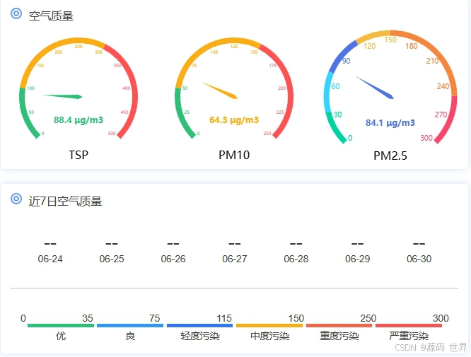 系统满足相关政策要求,系统对接环境监测设备,包括风速传感器、风向传感器、温度传感器、湿度传感器、TSP传感器、扬尘(PM2.5)传感器、扬尘(PM10)传感器、噪声传感器,对工地的风速、风向、温度、湿度、扬尘等情况进行监测。