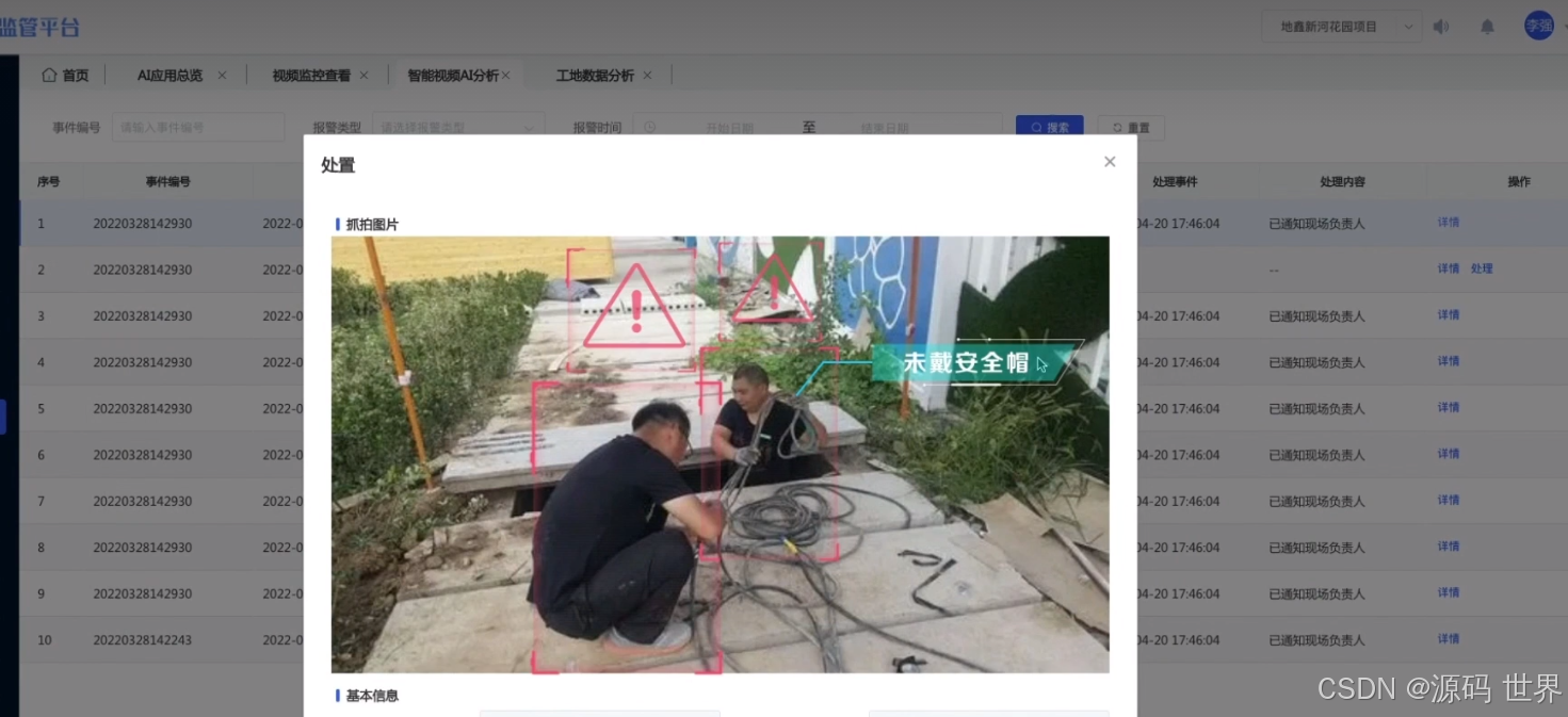 AI智能分析:利用计算机视觉技术,实时分析监控视频中的安全隐患(如未戴安全帽、危险区域闯入等)。