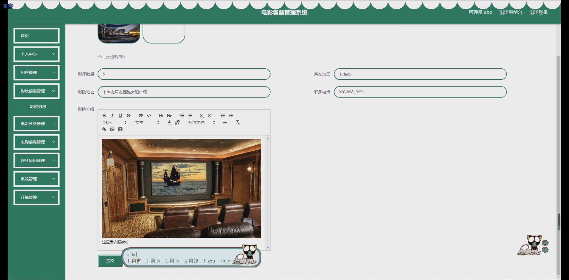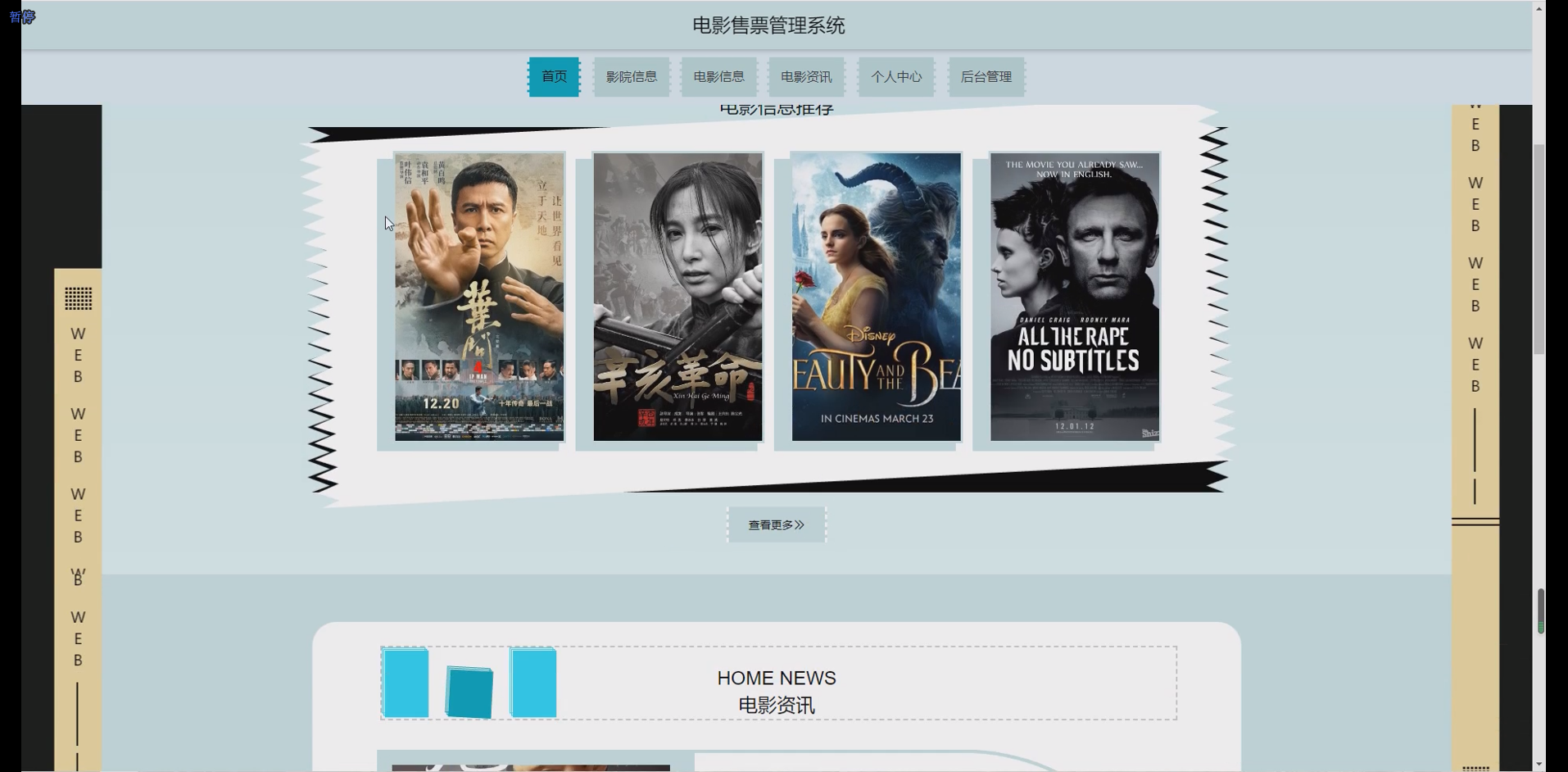 系统设计遵循 “简洁易用” 原则,用户端界面采用直观的导航栏与清晰的功能按钮,用户通过简单操作即可完成购票、评分等核心功能;管理员端后台管理页面布局规整,功能分类明确,影院管理人员经过简单培训即可熟练掌握系统操作,操作层面可行。