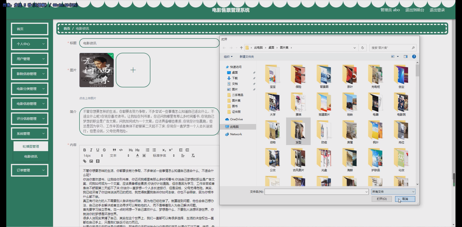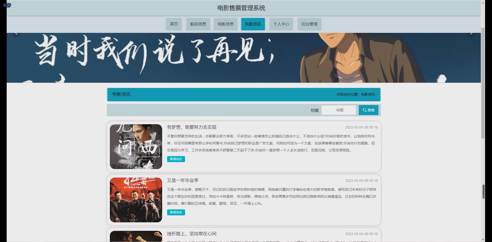 - 电影信息管理模块:管理员上传电影信息(包括海报、剧情、排期等),设置电影上映 / 下架状态;用户可浏览电影详情,查看影片排期(含放映时间、放映厅、剩余座位),并基于排期完成购票操作。
