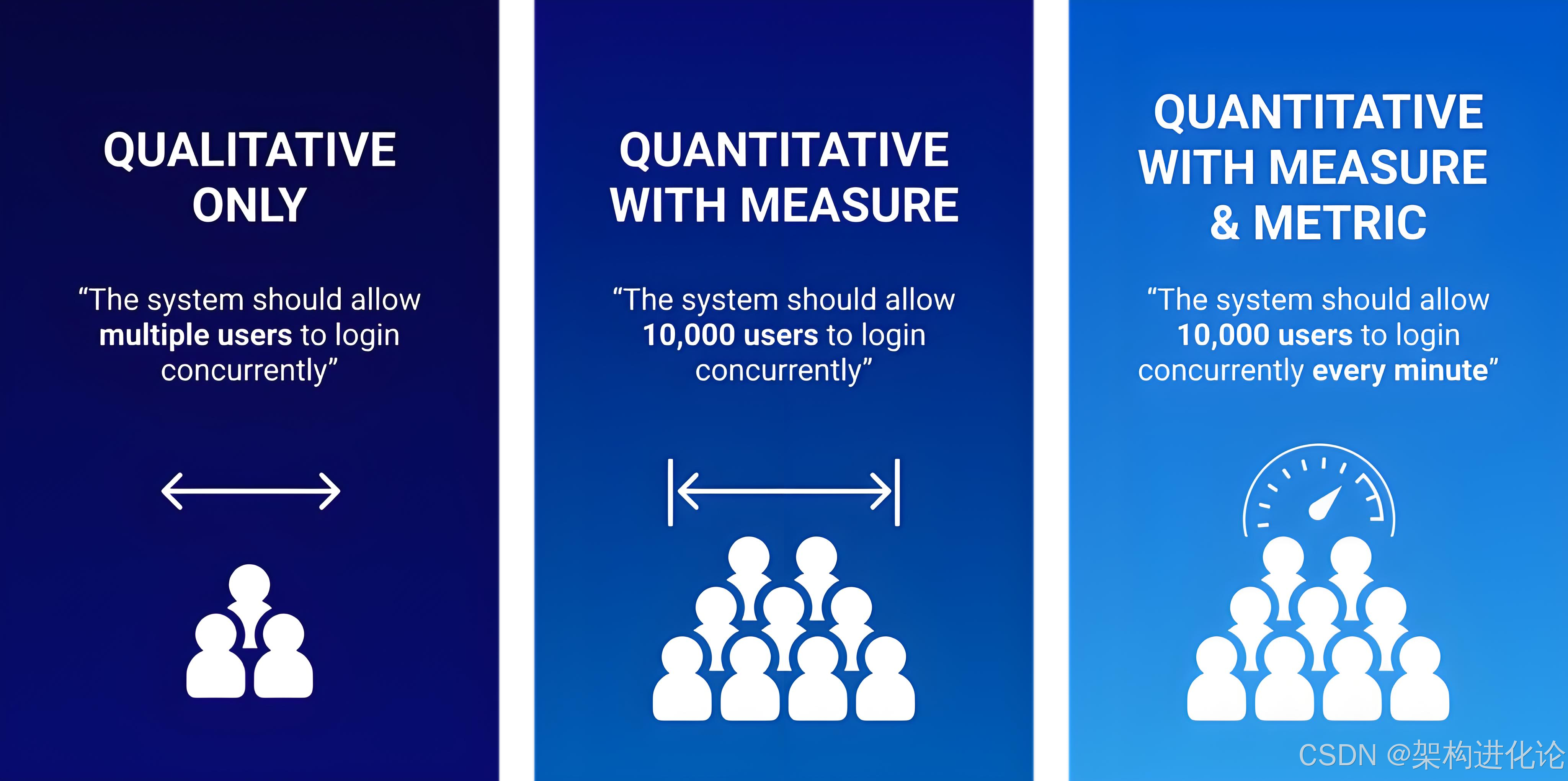 定性描述:“我们店的出餐速度要快。” -> 这相当于“系统要支持并发登录”。多快?无法衡量。