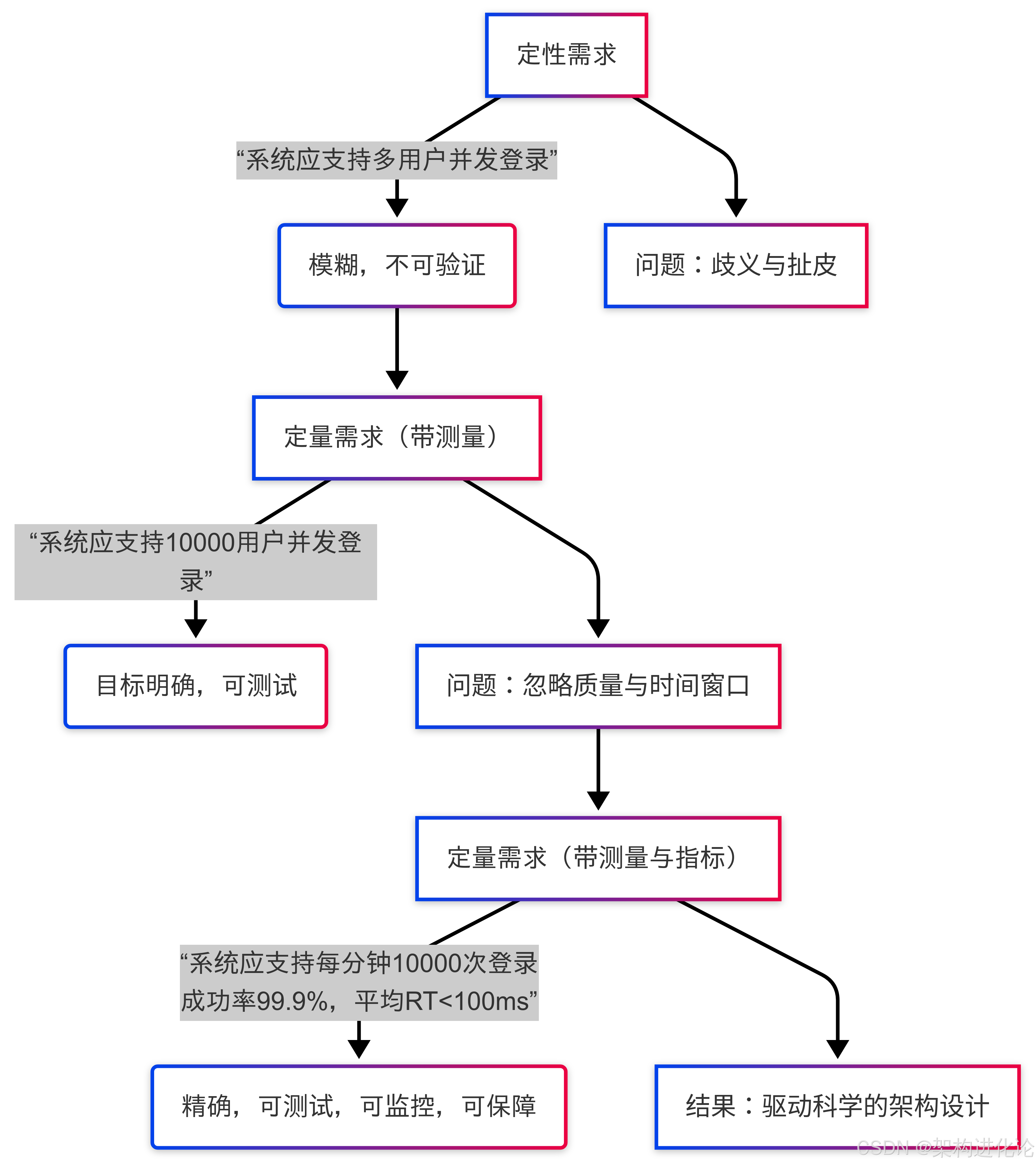 结论:功能性需求通常关注业务状态的正确性(如:“登录成功后,用户状态应变为‘已登录’”),其验证往往是通过断言结果是“是”或“否”来实现的。而非功能性需求(性能、可用性、扩展性等)本质上是关于程度和质量的,这就天然地需要指标这个可以度量“程度”和“质量”的工具来描述和约束。因此,指标更多地与非功能性需求相伴相生。
