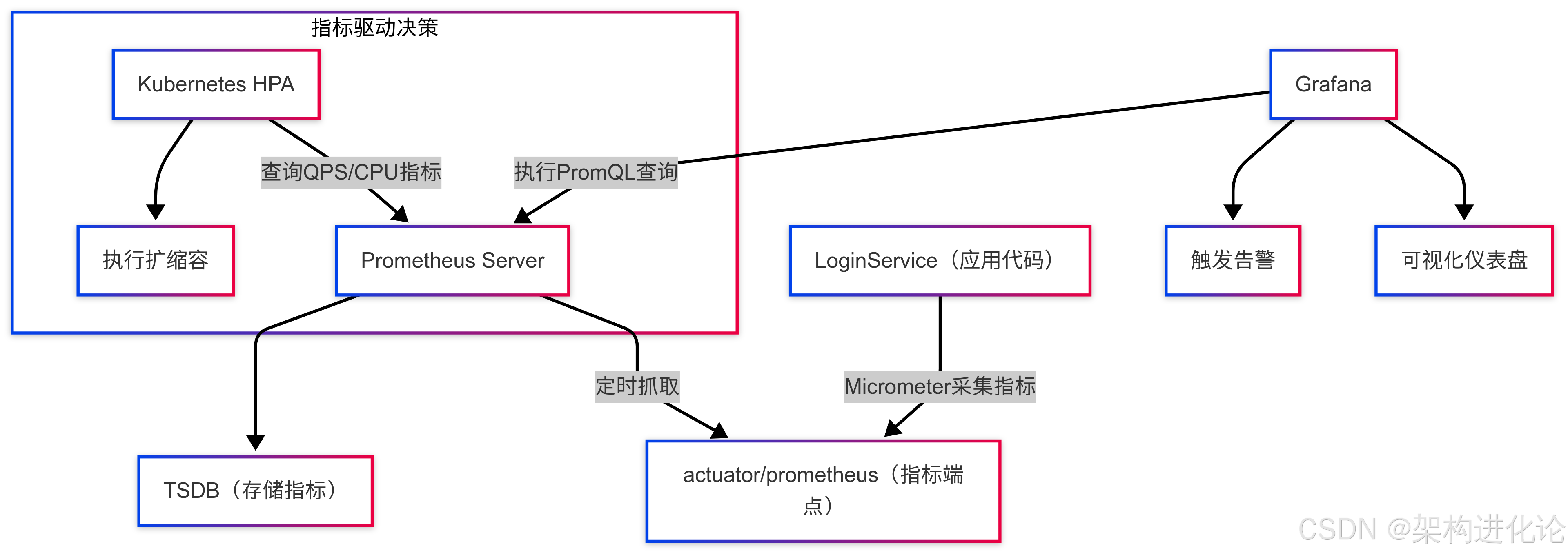 自动化决策:Kubernetes的Horizontal Pod Autoscaler(HPA)需要依赖CPU使用率、QPS等指标来决定是否扩容或缩容微服务实例。
