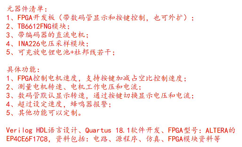 在电机控制系统中,实时监测电机的运行状态(如转速、电压、电流)对于系统稳定性、效率优化和故障诊断至关重要。本项目基于FPGA平台,利用Verilog HDL语言,设计一套完整的直流电机运行参数采集与显示系统,目标如下: