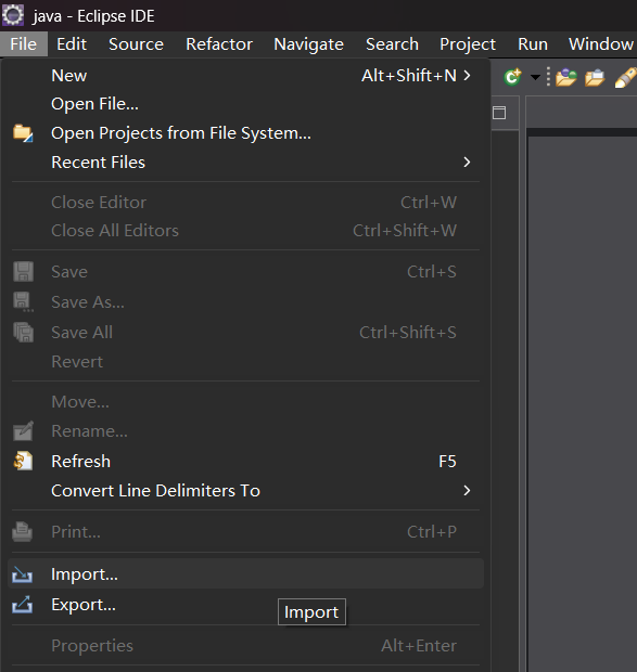 我们可以将项目重新导入到“Eclipse”中,点击“File”,点击“Import”