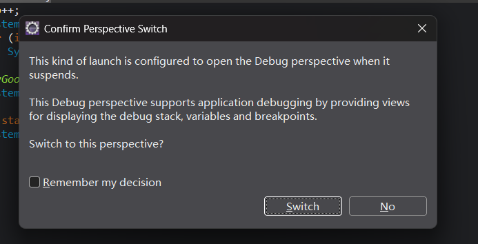 右键代码编辑处,点击“Debug As” ,选择“Java application”,点击“switch”打开debug视图