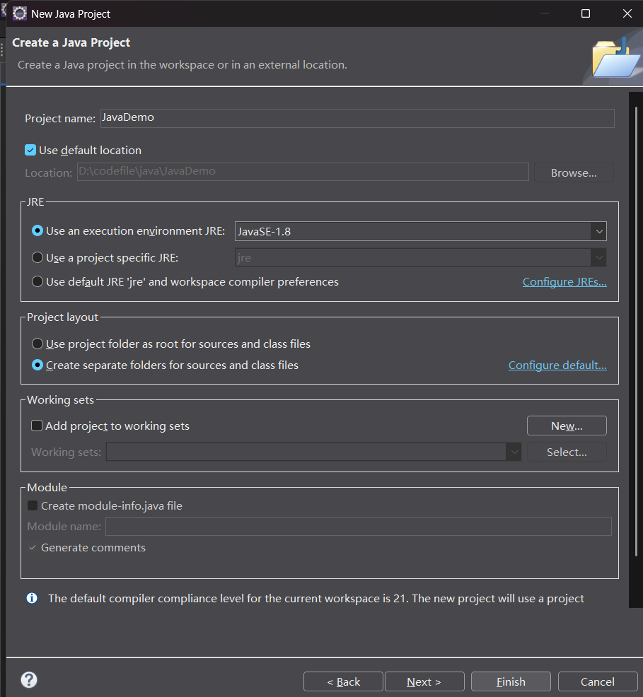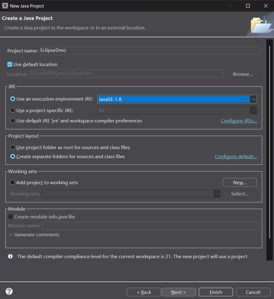 输入项目名称,如“EclipseDemo”,存储位置默认在你的工作空间下,选择你安装的jdk(jre在jdk文件夹里)版本