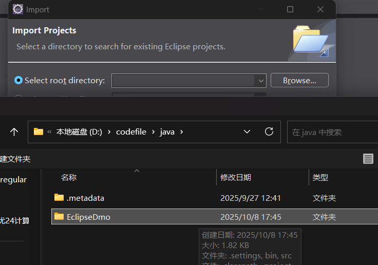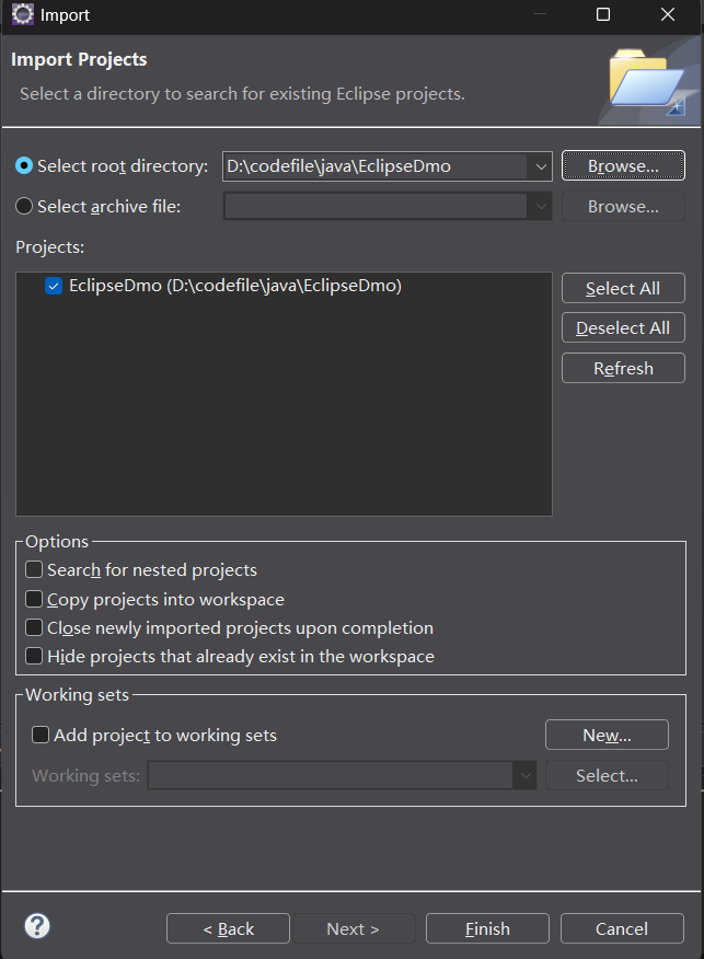 当前我们的项目知识一个简单的Java项目,没有涉及嵌套,点击“finish”。若包含嵌套,则还要勾选“Option”中的第一个“Search for nested projects”