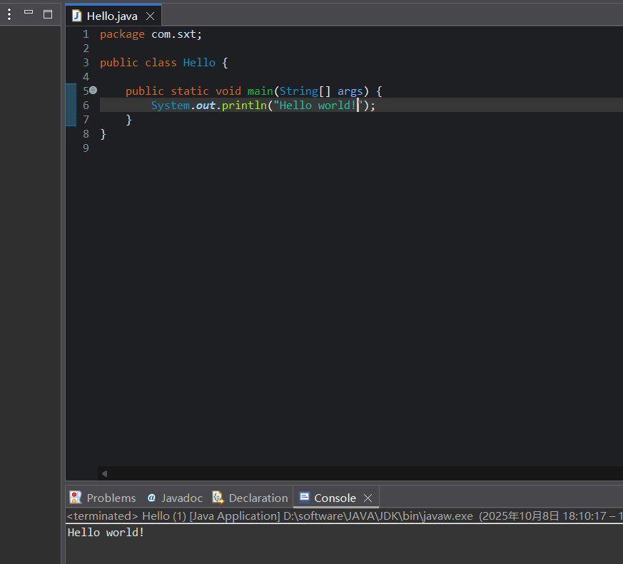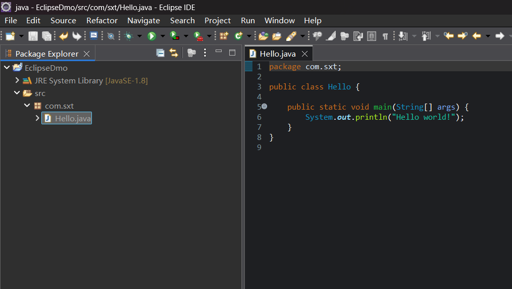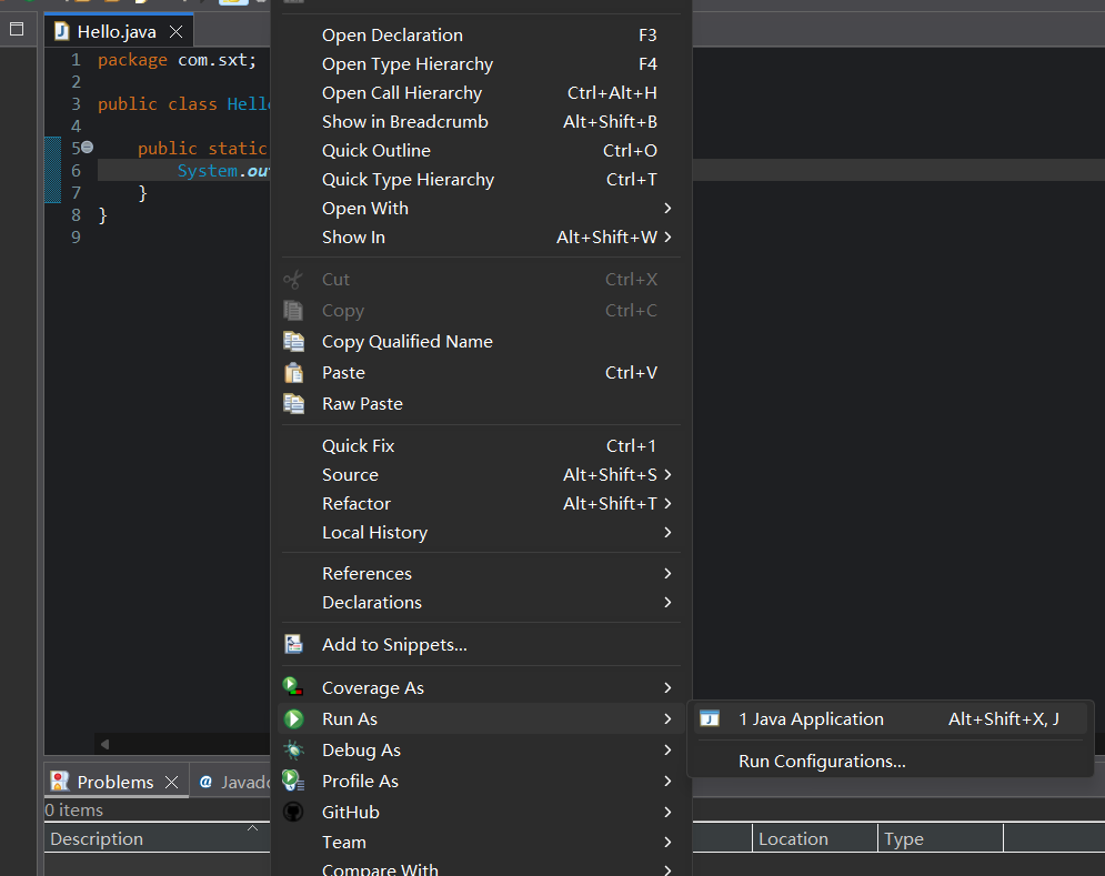 输入“Hello world”,鼠标右键代码编辑区,点击“Run As”,点击“Java Application”
