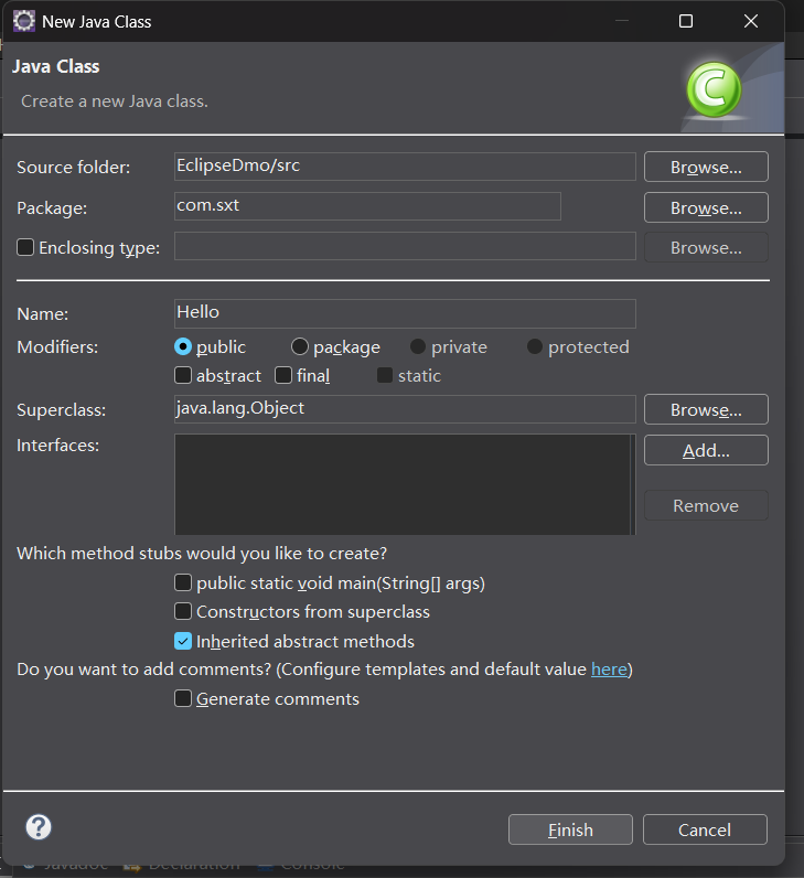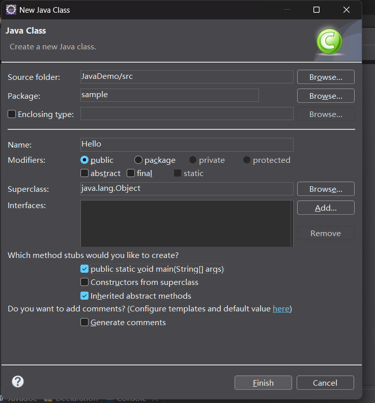 右键“src”,“New”一个“Class”,在“Package”框输入包名,在“Name”框输入类名,勾选“public static void main”,点击“Finish”