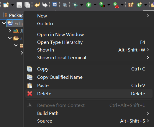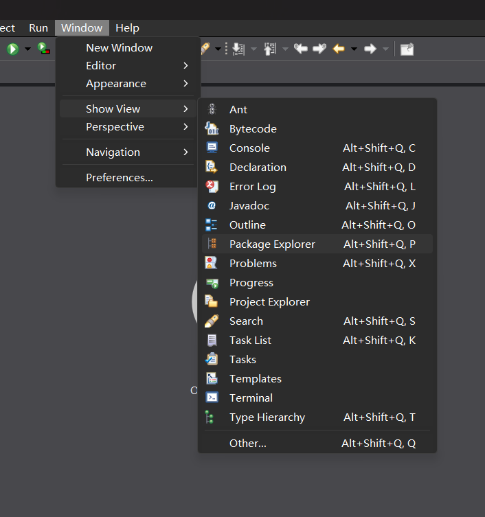 点击顶部菜单栏的“Window”,选择“Show View”,点击“Package explore”