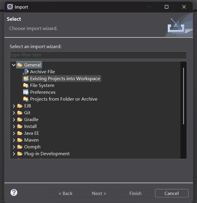 选择“General”,点击“Existing Projects into WorkSpace”(在工作空间中存在的工程),点击“Next”