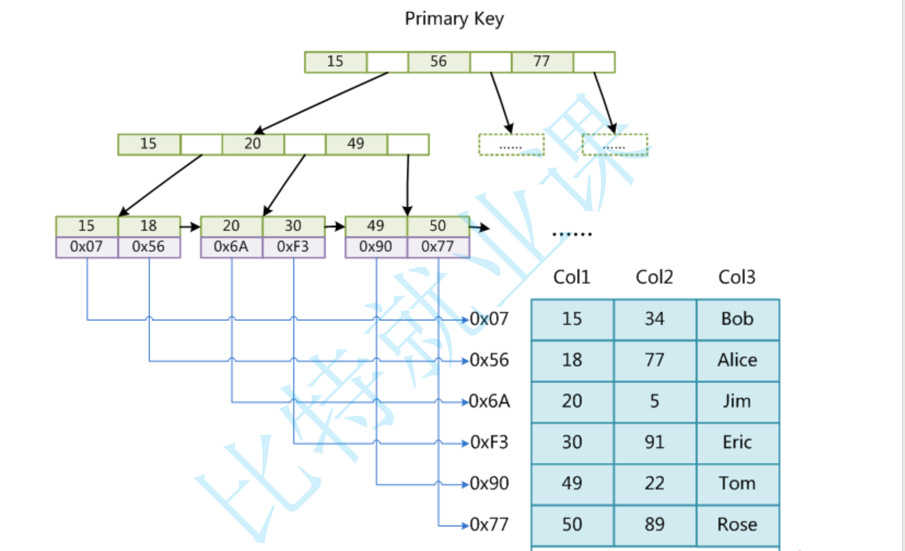 这样一来,单次筛选淘汰数量变多了,查找效率变快了。而且只让最底层page存数据,那么非叶子page就可以存更多的目录。