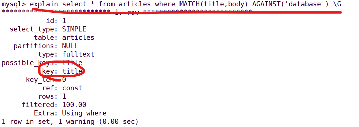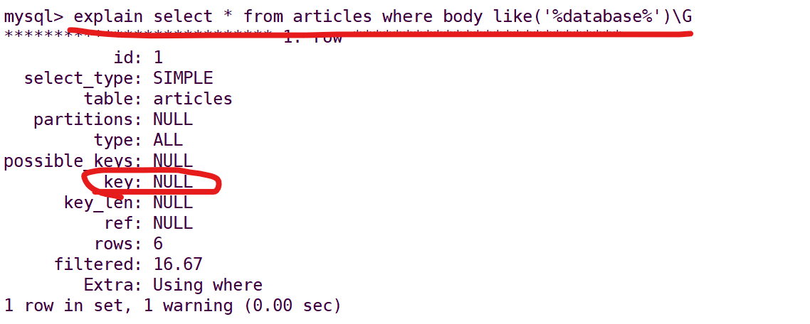 使用全文索引方式:select * from 表名 where MATCH(字段1,字段2...) AGAINST('database') 其中字段为创建全文索引时的字段