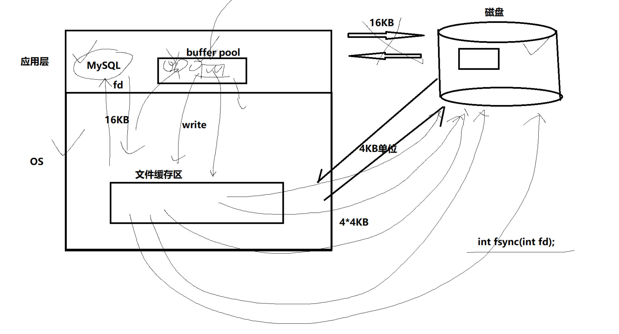 mysql是应用层的服务,由OS体系结构可以肯定,mysql访问磁盘(硬件)必须贯穿OS,通过内核文件缓冲区进行读取数据。数据需要持久化时就调用 fsync(int fd)刷新到外设(磁盘)。