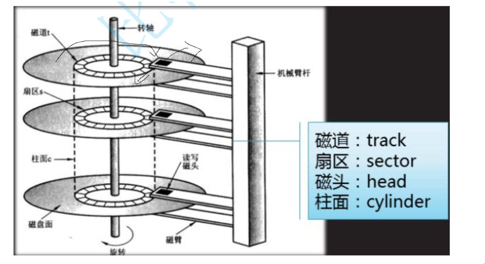 磁盘:CHS定址,磁头定柱面,柱面定磁道,磁道定扇区
