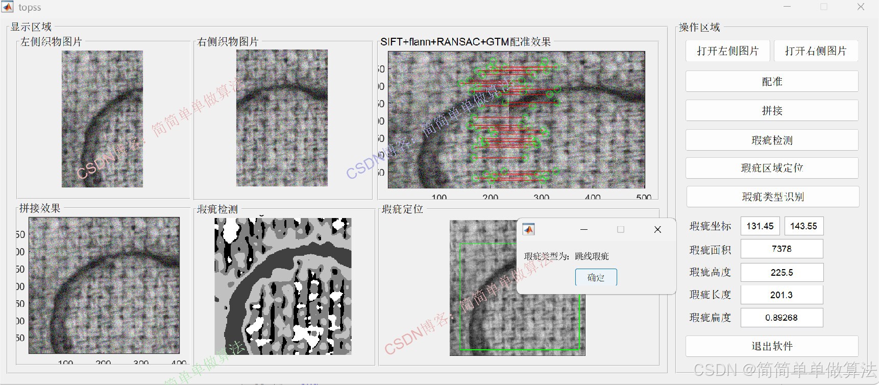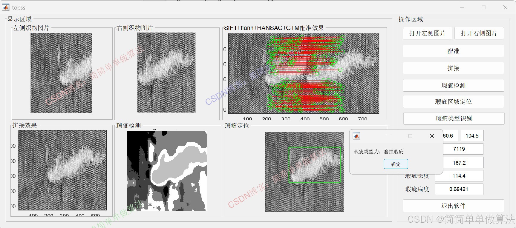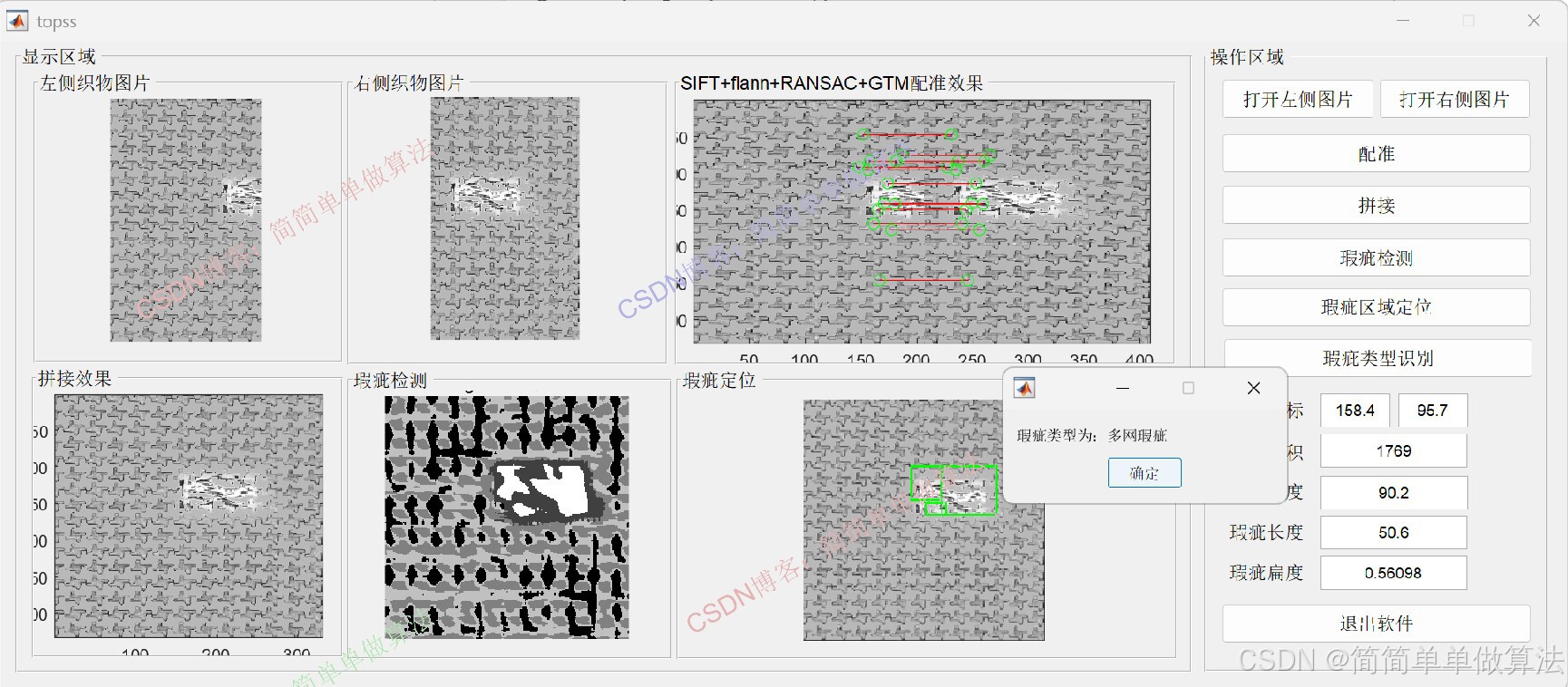 基于GA-SVM的织物瑕疵种类识别算法matlab仿真。输入织物图像,首先通过SIFT+flann+ RANSAC+GTM算法对织物图像进行拼接,然后通过garbor算法提取瑕疵区域,最后通过遗传优化SVM对织物瑕疵类型进行识别。