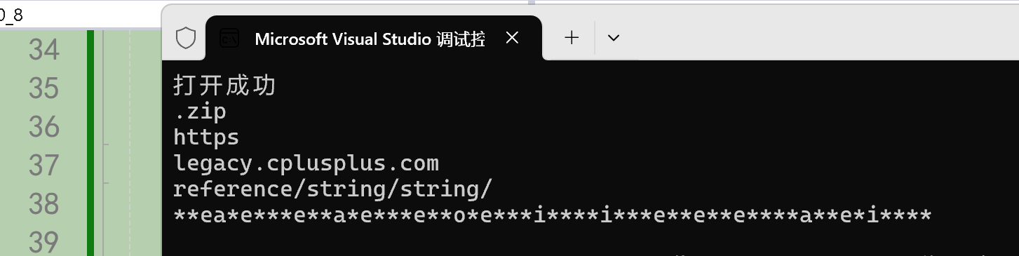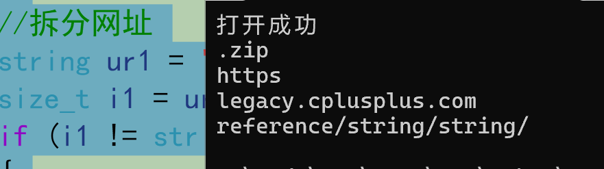 {//拆分网址string ur1 = "https://legacy.cplusplus.com/reference/string/string/";size_t i1 = ur1.find(':');if (i1 != string::npos){string protocl = ur1.substr(0, i1);cout << protocl << endl;size_t i2 = ur1.find('/', i1 + 3);if (i2 != string::npos){string domain = ur1.substr(i1 + 3, i2 - i1 - 3);cout << domain << endl;string uri = ur1.substr(i2 + 1);cout << uri << endl;}}return 0;
