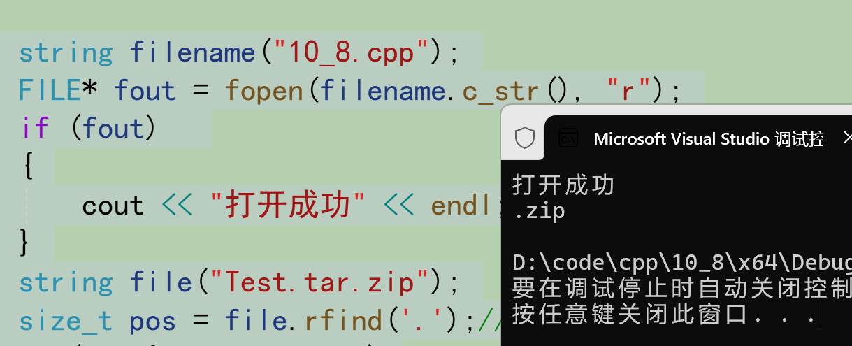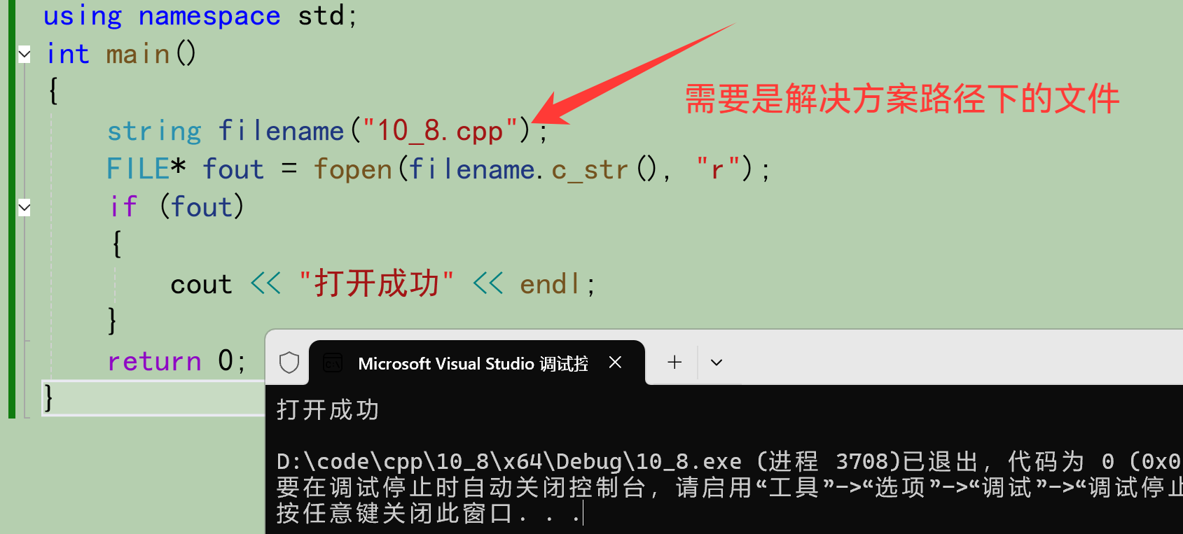 {string filename("10_8.cpp");FILE* fout = fopen(filename.c_str(), "r");if (fout) {cout << "打开成功" << endl;}return 0;
