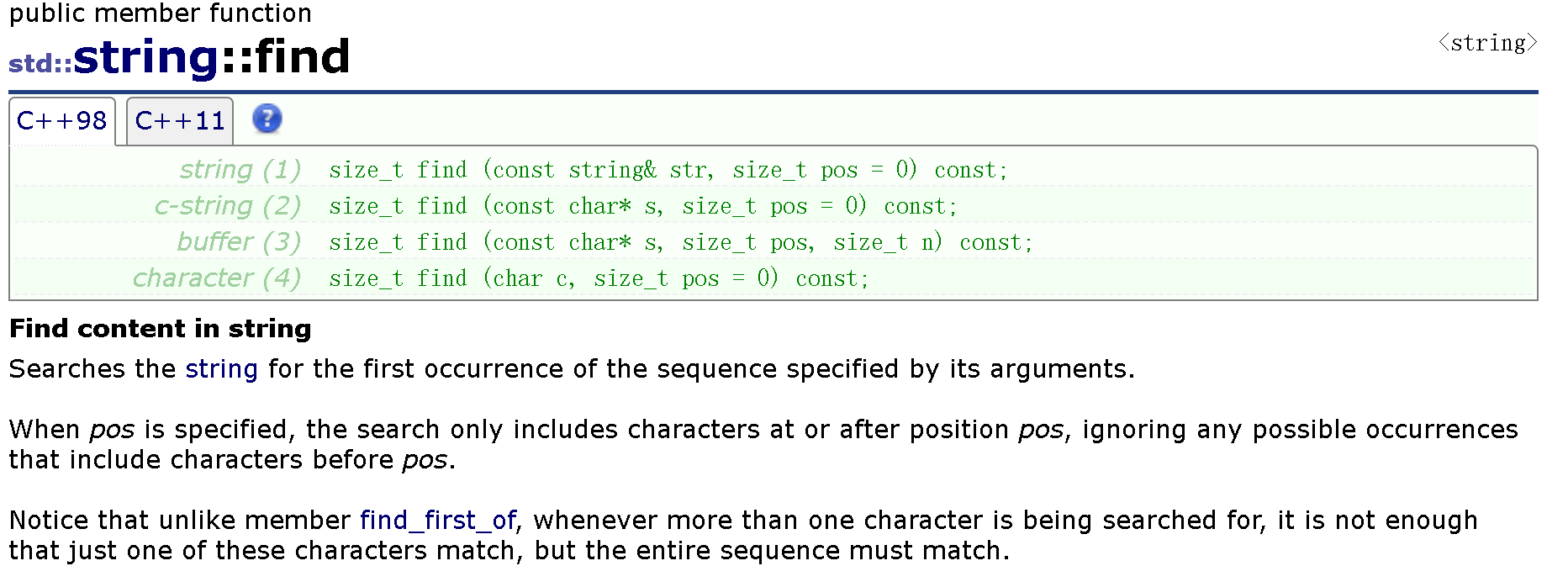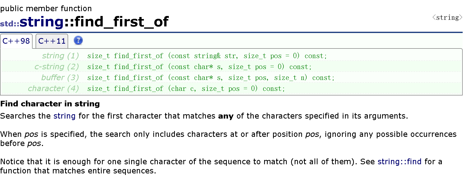 find_first_of,只要被查找的字符串中的字符在查找列表中出现,就会被返回它的pos。