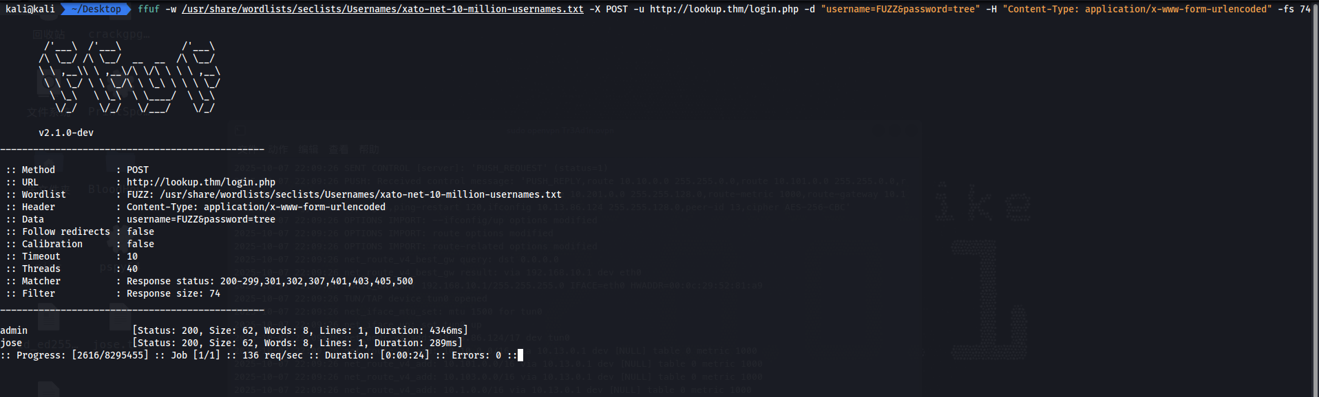 ffuf -w /usr/share/wordlists/seclists/Usernames/xato-net-10-million-usernames.txt -X POST -u http://lookup.thm/login.php -d "username=FUZZ&password=tree" -H "Content-Type: application/x-www-form-urlencoded" -fs 74