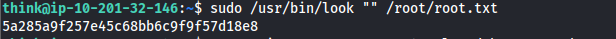 进入 think 的 shell 中,使用 sudo -l 查看 sudo 的权限,发现可以使用 look 命令,这个可以读取到文件,然后猜测 root 的 flag 是 root.txt,就拿到根 flag 了
