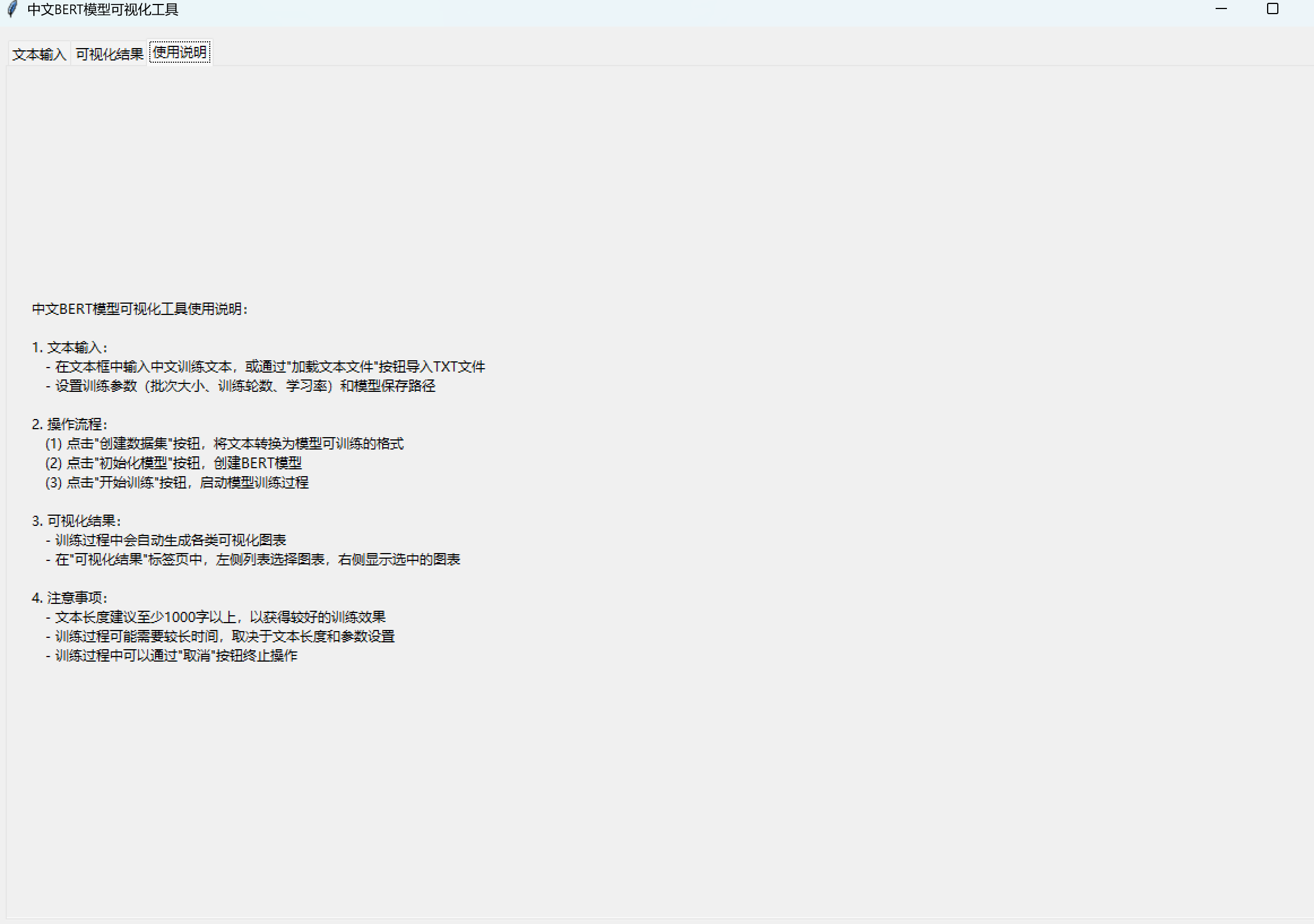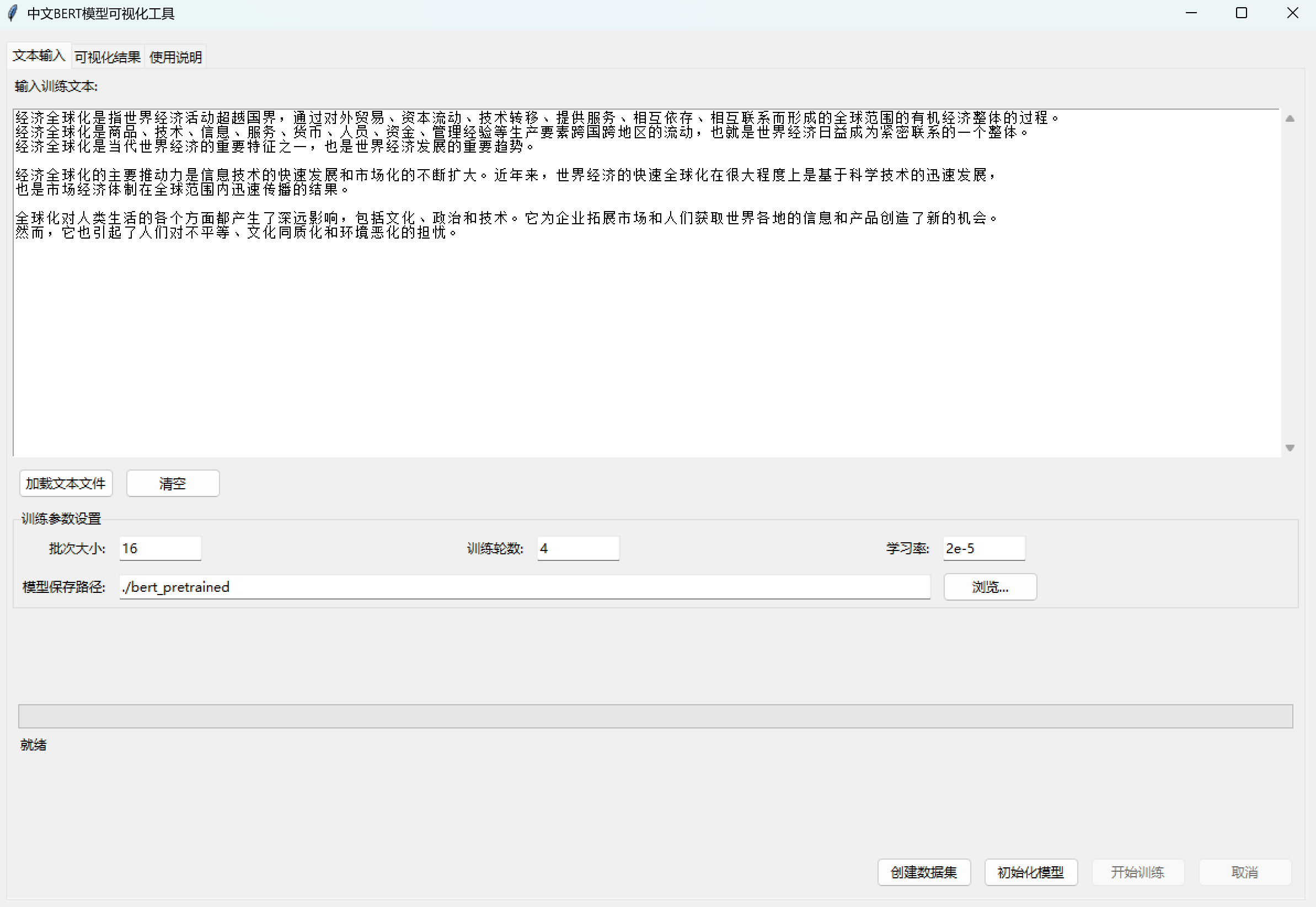然而,它也引起了人们对不平等、文化同质化和环境恶化的担忧。""")# 文件操作按钮file_frame = ttk.Frame(self.tab_input)file_frame.grid(row=2, column=0, sticky="w", padx=5, pady=5)ttk.Button(file_frame, text="加载文本文件", command=self.load_text_file).pack(side=tk.LEFT, padx=5)ttk.Button(file_frame, text="清空", command=lambda: self.text_input.delete(1.0, tk.END)).pack(side=tk.LEFT, padx=5)# 参数设置区域param_frame = ttk.LabelFrame(self.tab_input, text="训练参数设置")param_frame.grid(row=3, column=0, sticky="ew", padx=5, pady=5)param_frame.columnconfigure(1, weight=1)param_frame.columnconfigure(3, weight=1)param_frame.columnconfigure(5, weight=1)# 批次大小ttk.Label(param_frame, text="批次大小:").grid(row=0, column=0, sticky="e", padx=5, pady=5)self.batch_size_var = tk.StringVar(value="16")ttk.Entry(param_frame, textvariable=self.batch_size_var, width=10).grid(row=0, column=1, sticky="w", padx=5, pady=5)# 训练轮数ttk.Label(param_frame, text="训练轮数:").grid(row=0, column=2, sticky="e", padx=5, pady=5)self.epochs_var = tk.StringVar(value="4")ttk.Entry(param_frame, textvariable=self.epochs_var, width=10).grid(row=0, column=3, sticky="w", padx=5, pady=5)# 学习率ttk.Label(param_frame, text="学习率:").grid(row=0, column=4, sticky="e", padx=5, pady=5)self.lr_var = tk.StringVar(value="2e-5")ttk.Entry(param_frame, textvariable=self.lr_var, width=10).grid(row=0, column=5, sticky="w", padx=5, pady=5)# 模型保存路径ttk.Label(param_frame, text="模型保存路径:").grid(row=1, column=0, sticky="e", padx=5, pady=5)self.save_dir_var = tk.StringVar(value="./bert_pretrained")ttk.Entry(param_frame, textvariable=self.save_dir_var).grid(row=1, column=1, columnspan=4, sticky="ew", padx=5, pady=5)ttk.Button(param_frame, text="浏览...", command=self.choose_save_dir).grid(row=1, column=5, sticky="w", padx=5, pady=5)# 进度条和状态progress_frame = ttk.Frame(self.tab_input)progress_frame.grid(row=4, column=0, sticky="ew", padx=5, pady=5)progress_frame.columnconfigure(0, weight=1)self.progress_var = tk.DoubleVar()self.progress_bar = ttk.Progressbar(progress_frame, variable=self.progress_var, maximum=100)self.progress_bar.grid(row=0, column=0, sticky="ew", padx=5, pady=2)self.status_var = tk.StringVar(value="就绪")ttk.Label(progress_frame, textvariable=self.status_var).grid(row=1, column=0, sticky="w", padx=5, pady=2)# 操作按钮button_frame = ttk.Frame(self.tab_input)button_frame.grid(row=5, column=0, sticky="e", padx=5, pady=10)self.create_dataset_btn = ttk.Button(button_frame, text="创建数据集", command=self.create_dataset)self.create_dataset_btn.pack(side=tk.LEFT, padx=5)self.init_model_btn = ttk.Button(button_frame, text="初始化模型", command=self.initialize_model)self.init_model_btn.pack(side=tk.LEFT, padx=5)self.train_btn = ttk.Button(button_frame, text="开始训练", command=self.start_training, state=tk.DISABLED)self.train_btn.pack(side=tk.LEFT, padx=5)self.cancel_btn = ttk.Button(button_frame, text="取消", command=self.cancel_operation, state=tk.DISABLED)self.cancel_btn.pack(side=tk.LEFT, padx=5)def init_visualization_tab(self):"""初始化可视化标签页"""# 布局配置:列表框固定宽度,图表区拉伸self.tab_visualization.columnconfigure(0, weight=0, minsize=200)self.tab_visualization.columnconfigure(1, weight=1)self.tab_visualization.rowconfigure(0, weight=1)# 左侧图表列表self.fig_listbox = tk.Listbox(self.tab_visualization, selectmode=tk.SINGLE)self.fig_listbox.grid(row=0, column=0, sticky="nsew", padx=5, pady=5)self.fig_listbox.bind('<<ListboxSelect>>', self.on_figure_selected)# 列表框滚动条scrollbar = ttk.Scrollbar(self.tab_visualization,orient=tk.VERTICAL,command=self.fig_listbox.yview)scrollbar.grid(row=0, column=0, sticky="ns", padx=(185, 0))self.fig_listbox.config(yscrollcommand=scrollbar.set)# 右侧图表显示区self.fig_frame = ttk.Frame(self.tab_visualization)self.fig_frame.grid(row=0, column=1, sticky="nsew", padx=5, pady=5)self.fig_frame.columnconfigure(0, weight=1)self.fig_frame.rowconfigure(0, weight=1)def init_help_tab(self):"""初始化帮助标签页(保留原说明文本)"""help_text = """中文BERT模型可视化工具使用说明:1. 文本输入:- 在文本框中输入中文训练文本,或通过"加载文本文件"按钮导入TXT文件- 设置训练参数(批次大小、训练轮数、学习率)和模型保存路径2. 操作流程:(1) 点击"创建数据集"按钮,将文本转换为模型可训练的格式(2) 点击"初始化模型"按钮,创建BERT模型(3) 点击"开始训练"按钮,启动模型训练过程3. 可视化结果:- 训练过程中会自动生成各类可视化图表- 在"可视化结果"标签页中,左侧列表选择图表,右侧显示选中的图表4. 注意事项:- 文本长度建议至少1000字以上,以获得较好的训练效果- 训练过程可能需要较长时间,取决于文本长度和参数设置- 训练过程中可以通过"取消"按钮终止操作