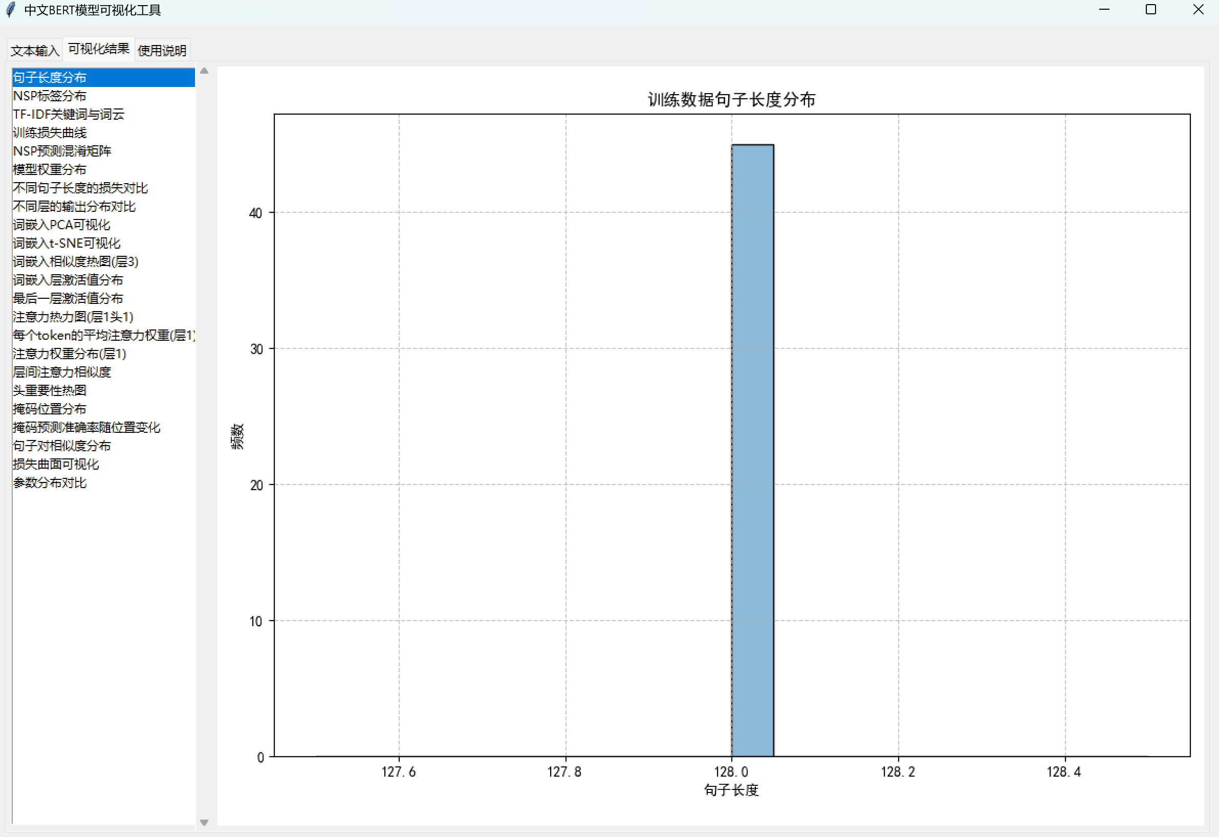 """help_label = ttk.Label(self.tab_help, text=help_text, justify=tk.LEFT, wraplength=1000)help_label.grid(row=0, column=0, padx=20, pady=20, sticky="nsew")# 帮助页布局适配self.tab_help.columnconfigure(0, weight=1)self.tab_help.rowconfigure(0, weight=1)def load_text_file(self):"""加载文本文件"""file_path = filedialog.askopenfilename(filetypes=[("文本文件", "*.txt"), ("所有文件", "*.*")])if file_path:try:with open(file_path, 'r', encoding='utf-8') as f:content = f.read()self.text_input.delete(1.0, tk.END)self.text_input.insert(tk.END, content)self.status_var.set(f"已加载文件: {file_path}")except Exception as e:messagebox.showerror("错误", f"加载文件失败: {str(e)}")def choose_save_dir(self):"""选择模型保存目录"""dir_path = filedialog.askdirectory()if dir_path:self.save_dir_var.set(dir_path)def create_dataset(self):"""创建数据集(与模型序列长度匹配)"""if self.is_creating_dataset or self.is_training:returntext = self.text_input.get(1.0, tk.END).strip()if not text:messagebox.showwarning("警告", "请输入训练文本")returnself.tokenizer = BertChineseTokenizer()# 更新状态self.is_creating_dataset = Trueself.create_dataset_btn.config(state=tk.DISABLED)self.init_model_btn.config(state=tk.DISABLED)self.train_btn.config(state=tk.DISABLED)self.cancel_btn.config(state=tk.NORMAL)self.status_var.set("正在创建数据集...")self.progress_var.set(0)# 启动数据集创建线程(指定max_seq_len=128,与模型匹配)self.dataset_thread = threading.Thread(target=self._create_dataset_thread,args=(text, 128),daemon=True)self.dataset_thread.start()def _create_dataset_thread(self, text, max_seq_len):"""数据集创建线程"""try:self.dataset = TextDataset(text=text,tokenizer=self.tokenizer,max_seq_len=max_seq_len,progress_queue=self.dataset_queue)self.dataset_queue.put(("done", "数据集创建成功"))except Exception as e:self.dataset_queue.put(("error", f"创建数据集失败: {str(e)}"))def initialize_model(self):"""初始化BERT模型"""if not self.dataset:messagebox.showwarning("警告", "请先创建数据集")returntry:# 模型配置(维度保持一致)config = BertConfig(vocab_size=self.tokenizer.vocab_size,hidden_size=128,num_hidden_layers=2,num_heads=2,intermediate_size=512,max_position_embeddings=128)# 创建模型bert_model = BertModel(config)self.model = BertForPretraining(bert_model)# 启用训练按钮self.train_btn.config(state=tk.NORMAL)self.status_var.set("模型初始化成功")except Exception as e:messagebox.showerror("错误", f"初始化模型失败: {str(e)}")self.status_var.set("初始化模型失败")def start_training(self):"""启动训练"""if not self.dataset or not self.model or self.is_training or self.is_creating_dataset:returntry:# 获取训练参数batch_size = int(self.batch_size_var.get())num_epochs = int(self.epochs_var.get())lr = float(self.lr_var.get())save_dir = self.save_dir_var.get()# 清空历史可视化结果self.visualizer.clear_figures()self.fig_listbox.delete(0, tk.END)# 更新状态self.is_training = Trueself.create_dataset_btn.config(state=tk.DISABLED)self.init_model_btn.config(state=tk.DISABLED)self.train_btn.config(state=tk.DISABLED)self.cancel_btn.config(state=tk.NORMAL)self.status_var.set("准备开始训练...")self.progress_var.set(0)# 启动训练线程self.training_thread = threading.Thread(target=self._training_thread,args=(batch_size, num_epochs, lr, save_dir),daemon=True)self.training_thread.start()except ValueError:messagebox.showerror("错误", "请检查输入的参数是否有效")except Exception as e:messagebox.showerror("错误", f"启动训练失败: {str(e)}")def _training_thread(self, batch_size, num_epochs, lr, save_dir):"""训练线程(调用train_bert函数)"""try:train_bert(model=self.model,train_dataset=self.dataset,batch_size=batch_size,num_train_epochs=num_epochs,learning_rate=lr,output_dir=save_dir,visualizer=self.visualizer,progress_queue=self.progress_queue)self.progress_queue.put(("done", "训练完成"))except Exception as e:self.progress_queue.put(("error", f"训练失败: {str(e)}"))def cancel_operation(self):"""取消当前操作"""if self.is_training:self.is_training = Falseself.status_var.set("正在取消训练...")elif self.is_creating_dataset:self.is_creating_dataset = Falseself.status_var.set("正在取消数据集创建...")def on_figure_selected(self, event):"""选中图表并显示(保留原交互逻辑)"""selection = self.fig_listbox.curselection()if not selection:return# 清除旧图表和工具栏if hasattr(self, 'canvas') and self.canvas:self.canvas.get_tk_widget().destroy()if hasattr(self, 'toolbar') and self.toolbar:self.toolbar.destroy()# 获取选中的图表fig_name = self.fig_listbox.get(selection[0])self.current_figure = self.visualizer.figures.get(fig_name)# 主线程更新图表显示def show_figure():if self.current_figure:# 创建画布(适配保留的图表类型)self.canvas = FigureCanvasTkAgg(self.current_figure, master=self.fig_frame)self.canvas.draw()self.canvas.get_tk_widget().grid(row=0, column=0, sticky="nsew")# 工具栏布局self.toolbar = NavigationToolbar2Tk(self.canvas, self.fig_frame)self.toolbar.update()self.toolbar.grid(row=1, column=0, sticky="ew")self.root.after(0, show_figure)def on_tab_changed(self, event):"""标签页切换时更新图表列表"""current_tab = self.notebook.select()if current_tab == str(self.tab_visualization):self.fig_listbox.delete(0, tk.END)for fig_name in self.visualizer.figures.keys():self.fig_listbox.insert(tk.END, fig_name)def generate_visualizations(self):"""主线程生成可视化(仅调用保留的方法)"""if not hasattr(self, 'model') or not hasattr(self, 'dataset') or not hasattr(self, 'visualizer'):returnself.visualizer.clear_figures()try:device = torch.device("cuda" if torch.cuda.is_available() else "cpu")self.model.to(device)self.model.eval()# 数据分布类可视化self.visualizer.plot_sentence_length_distribution(self.dataset)self.visualizer.plot_nsp_label_distribution(self.data