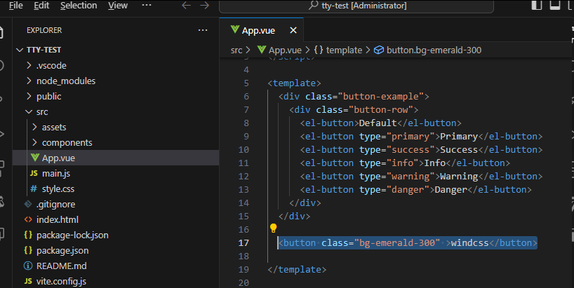 修改App.vue 里面的内容,验证Element-plus引入是否成功。