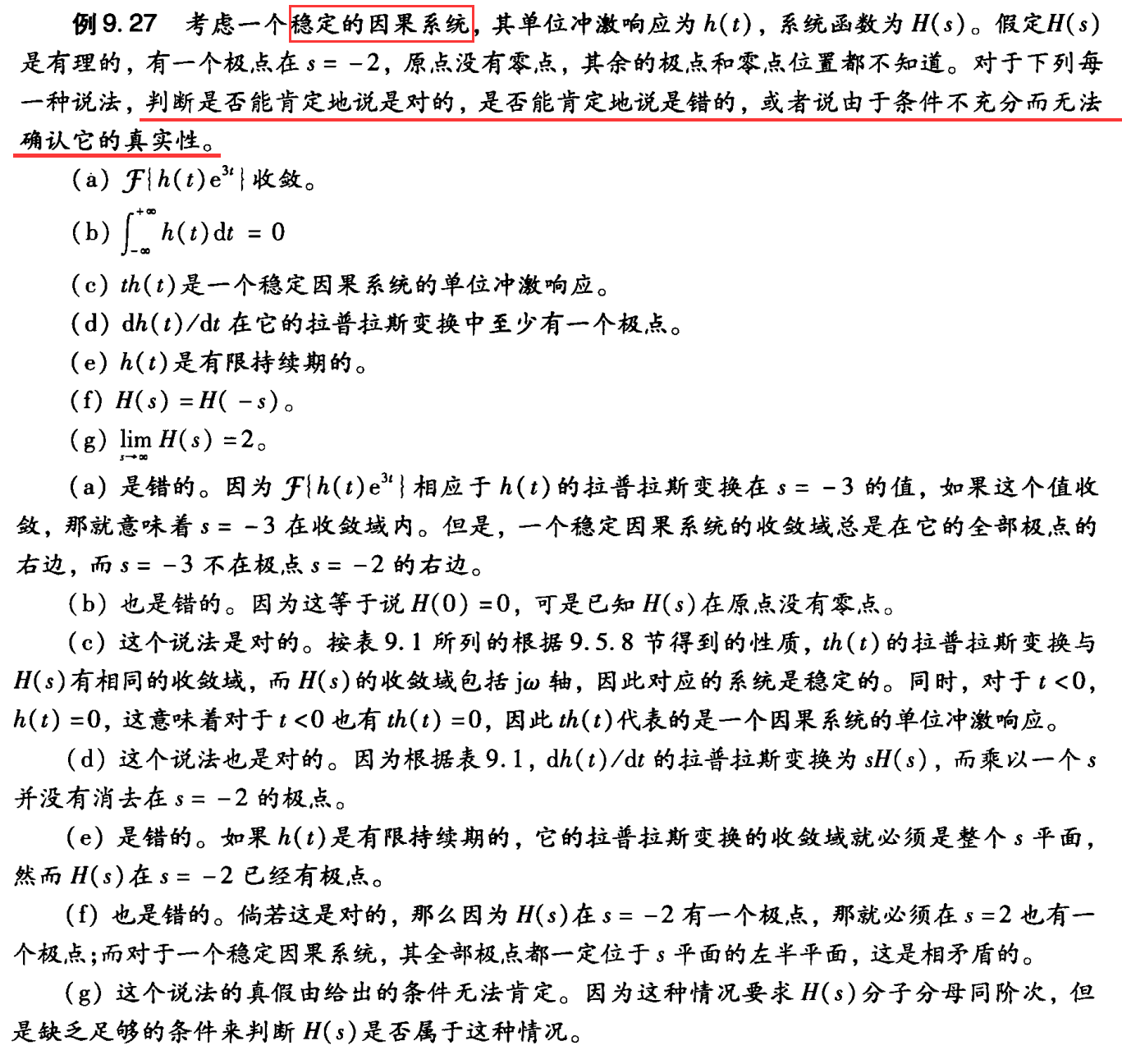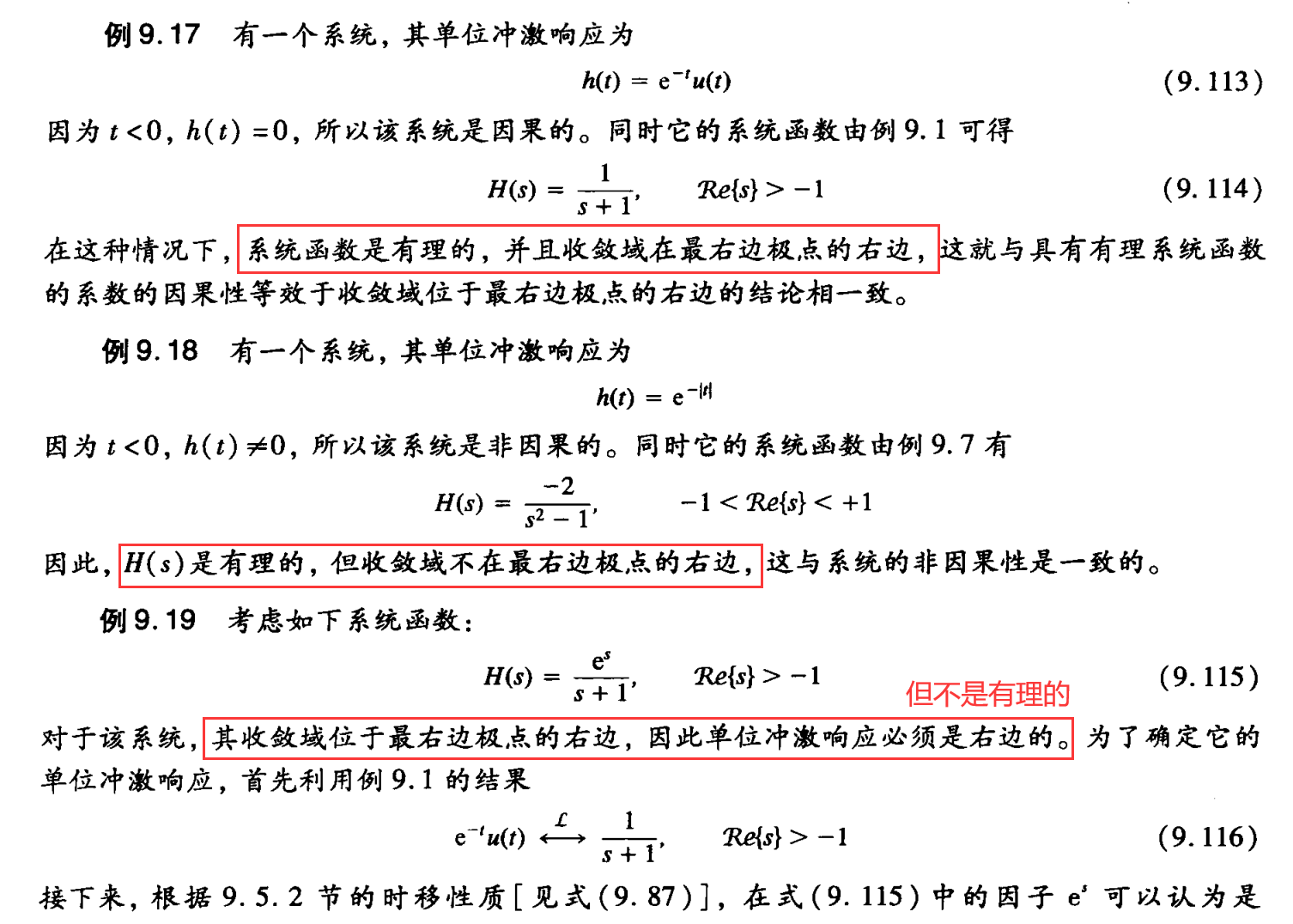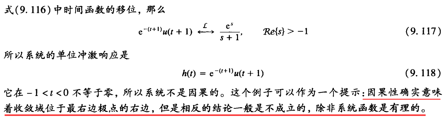 当然,一个系统是稳定(或不稳定)的,而有一个非有理的系统函数,这完全是可能的。例如,式(9.115)的系统函数不是有理的(含e^s),而它的单位冲激响应式(9.118)是绝对可积的,这就表明系统是稳定的。