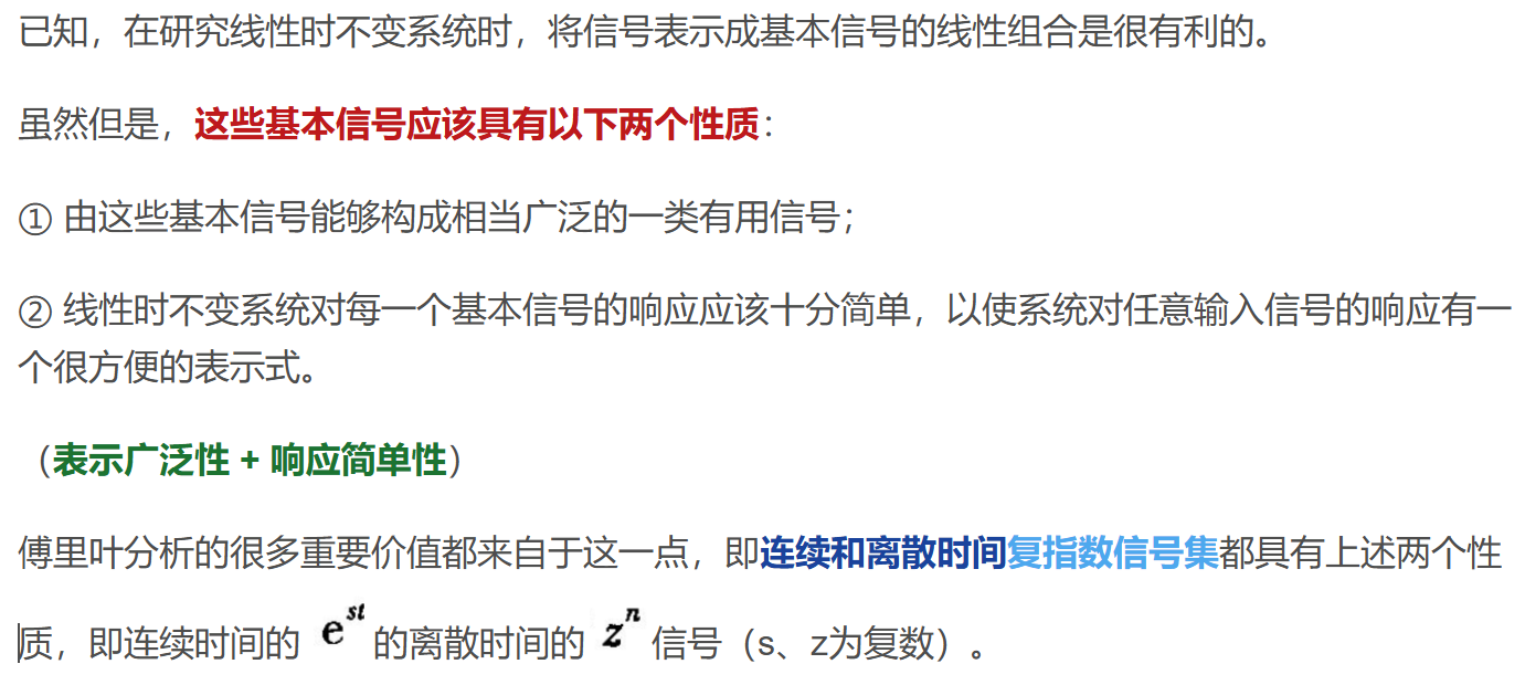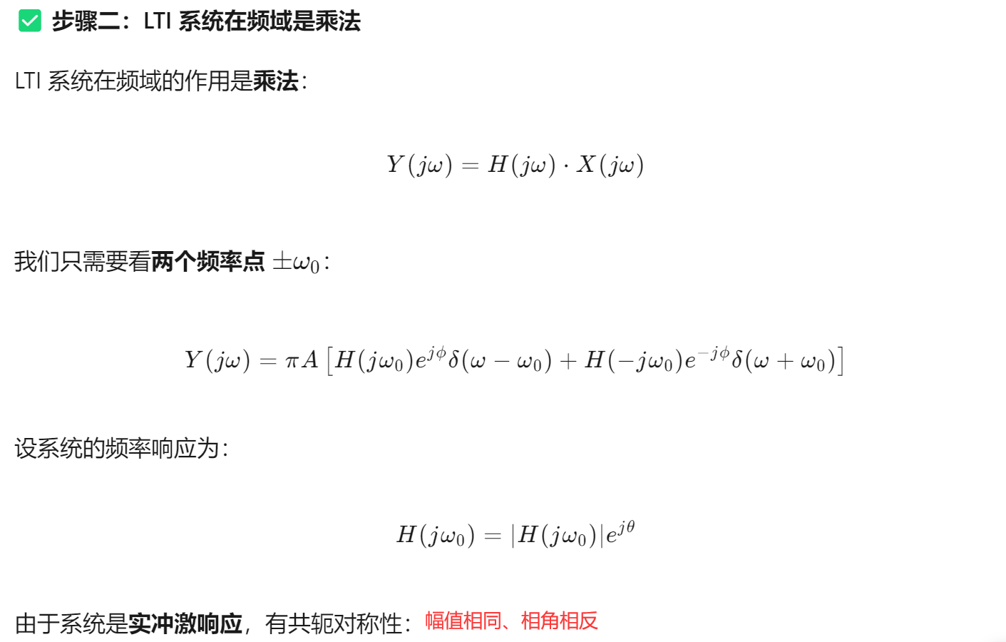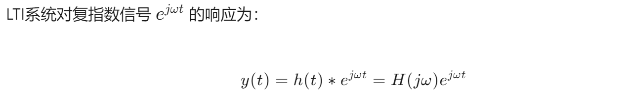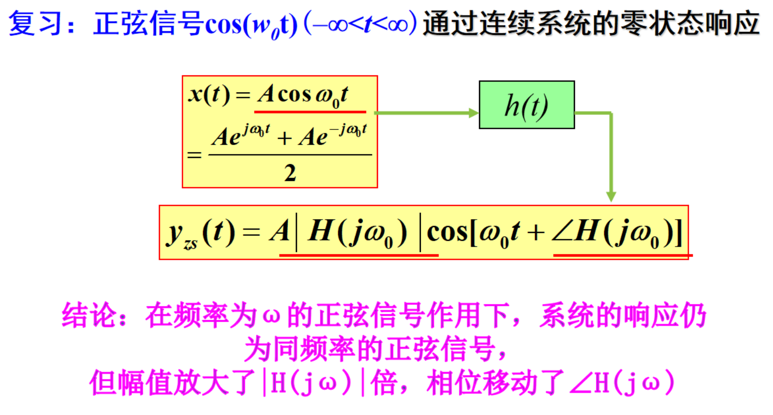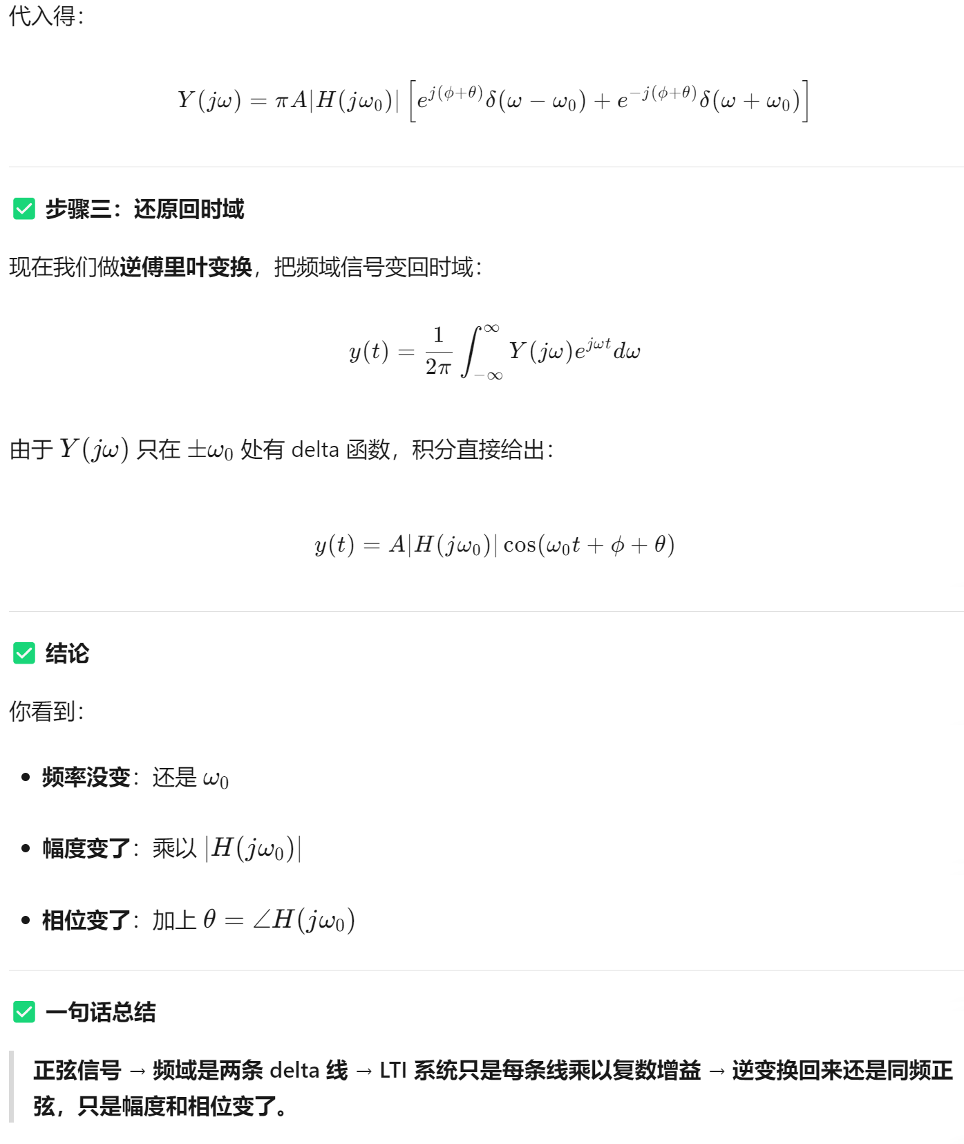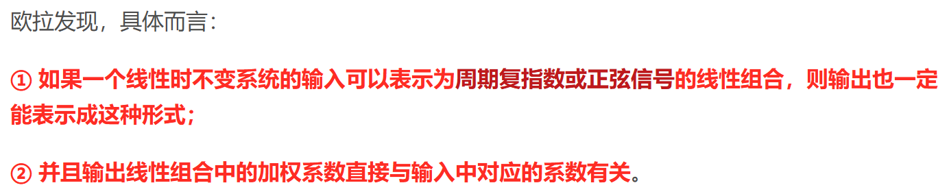 - LTI系统对简单周期函数的线性组合的响应就是对简单周期函数的响应的线性组合。