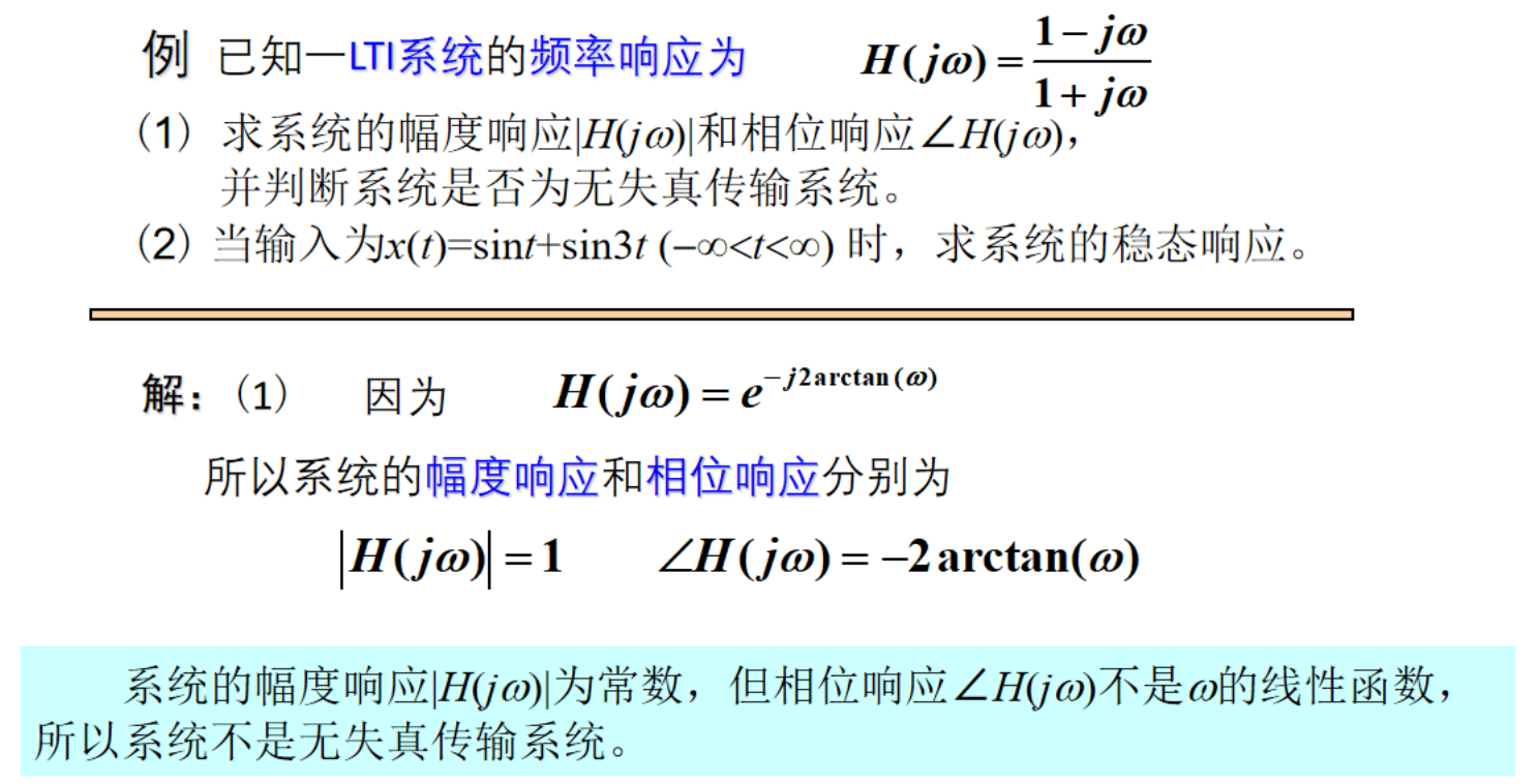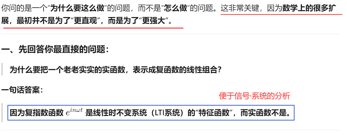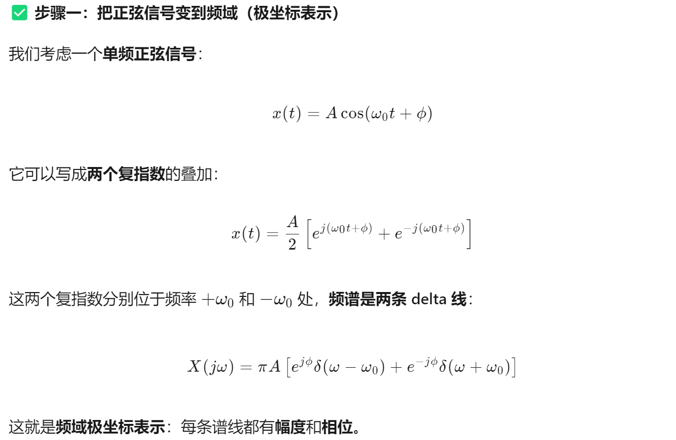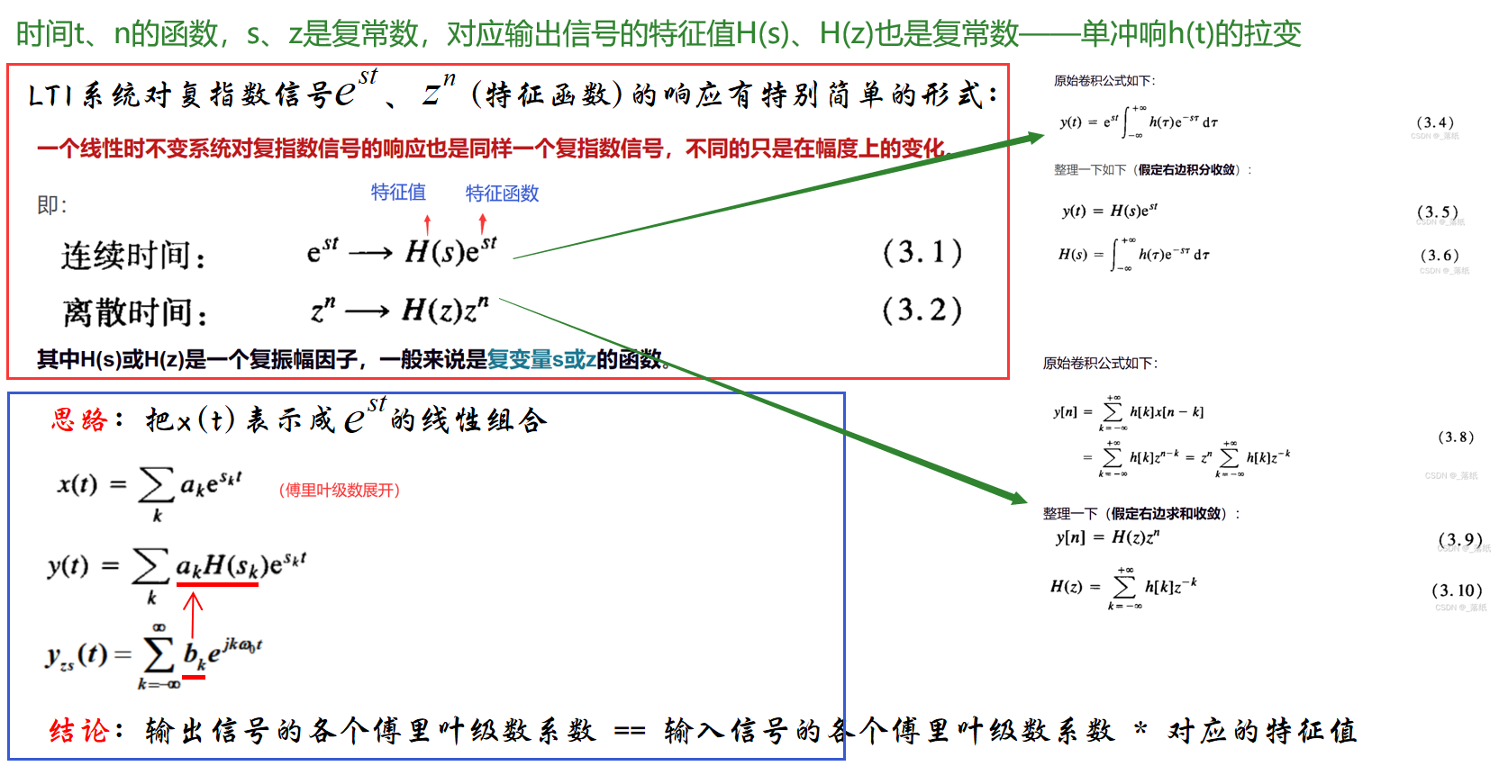 - LTI系统对简单周期函数的线性组合的响应就是对简单周期函数的响应的线性组合。