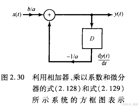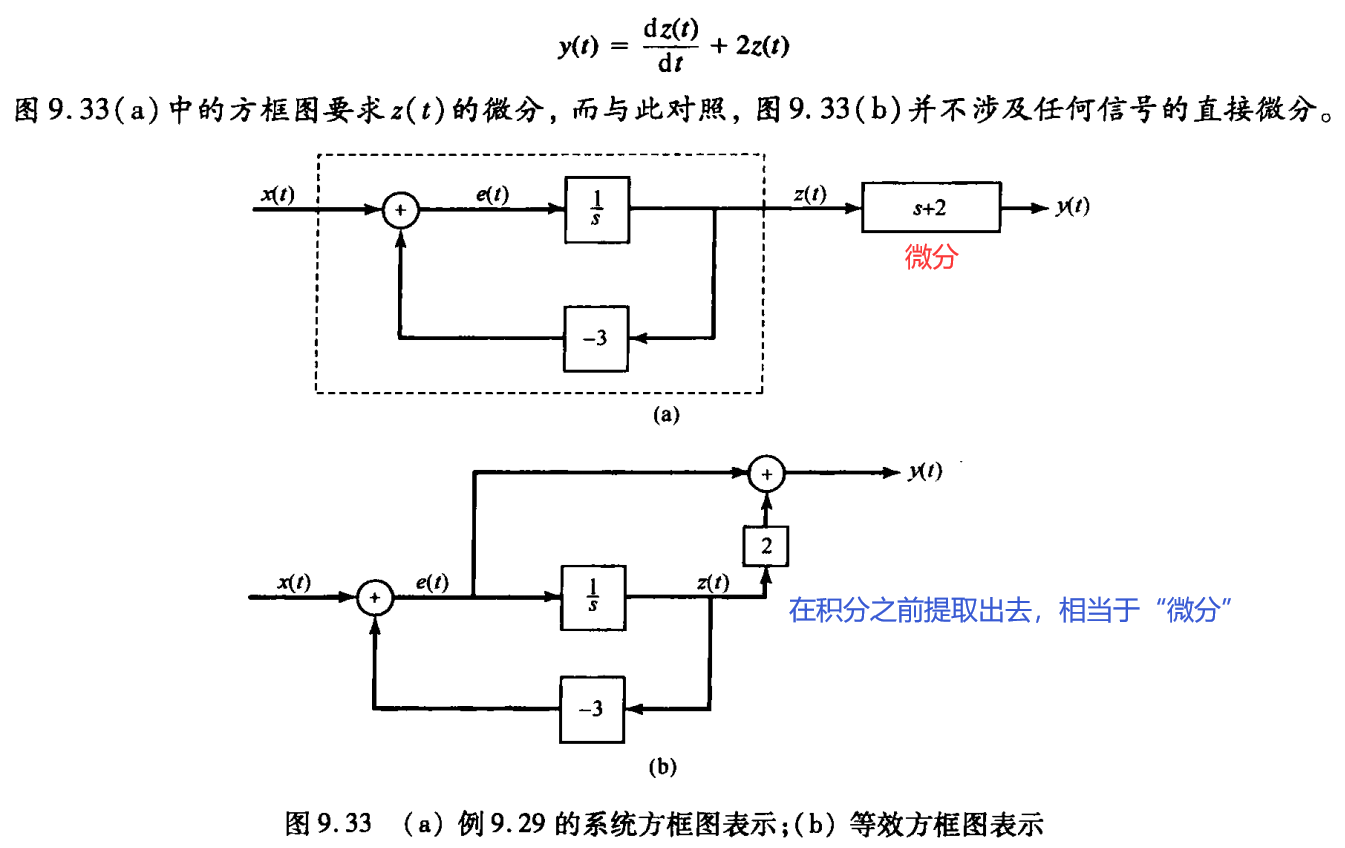 虽然图2.30是由式(2.128)描述的因果系统的一种正确表示,但是它并不是最常用的或者直接导致实际实现的表示,这是因为微分器不仅实现困难,并且对误差和噪声又极为灵敏。