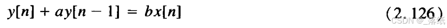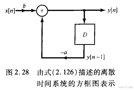 这就是一个反馈系统的例子,因为输出经由一个延迟并乘以一个系数反馈回来,然后与bx[n]相加。反馈的存在是式(2.127)递归性质的一个直接结果。