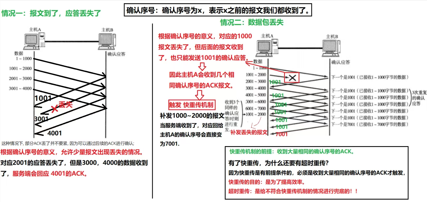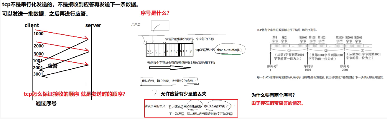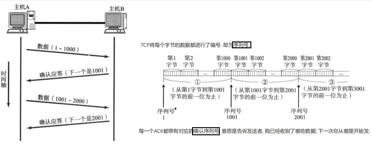 每一个ACK都带有对应的确认序列号, 意思是告诉发送者, 我已经收到了哪些数据; 下一次你从哪里开始发.
