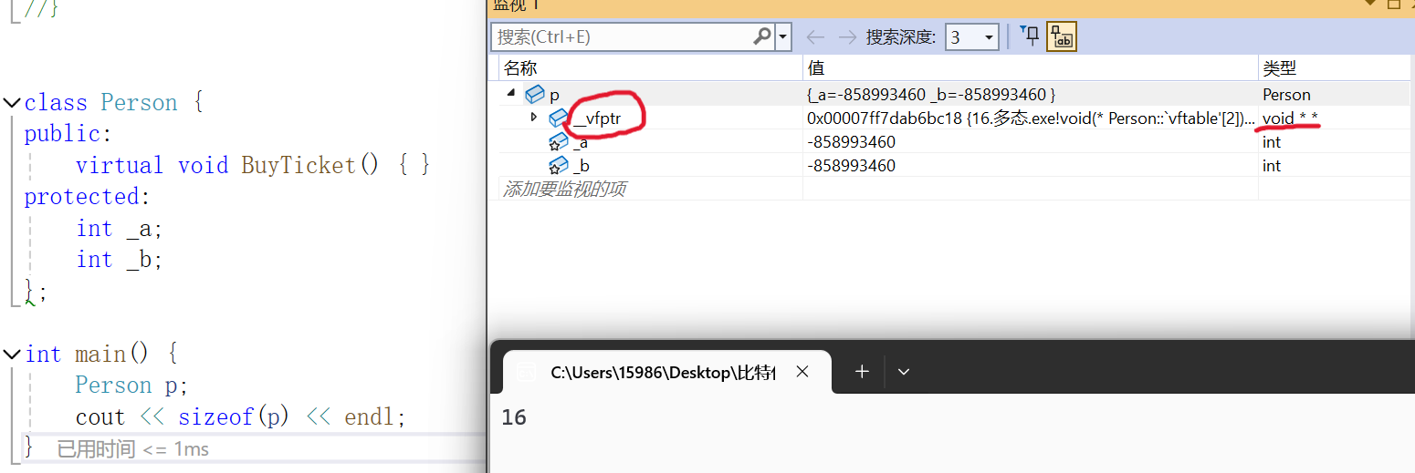 可以看到p对象中多了一个_vfptr的指针,指向一个指针数组。并且p对象的大小也变成了16字节。(64位操作系统下的指针是8字节,再加上两个int类型的数据)