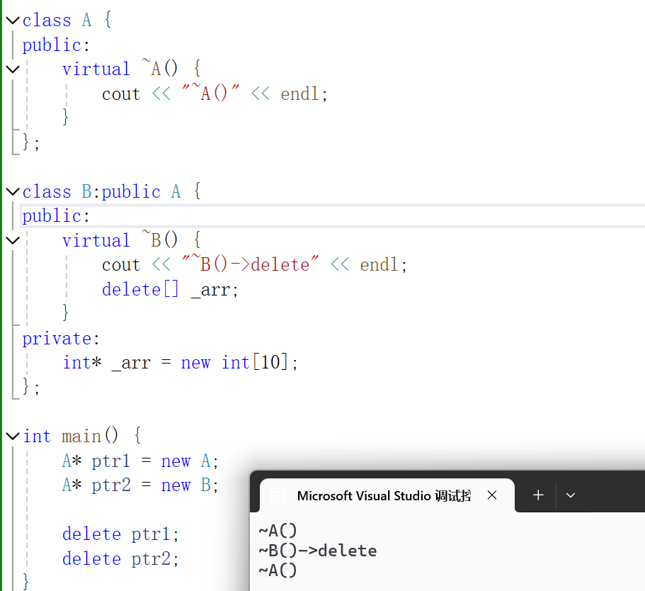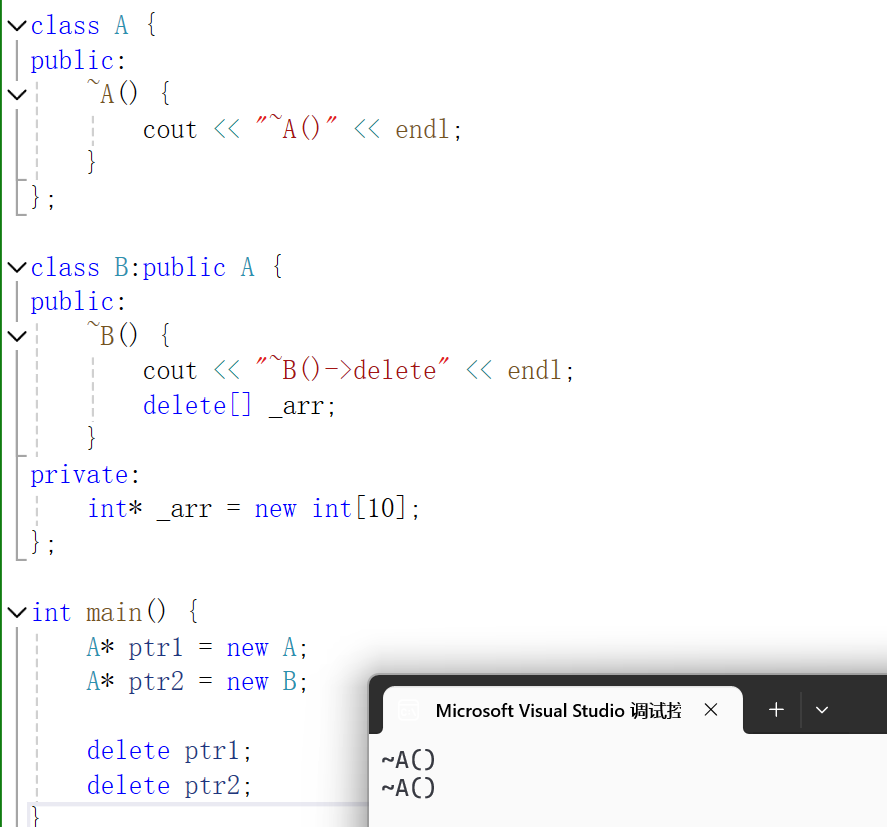 可以看到我们创建了一个A类的对象,一个B类的对象,又由于A是基类,所以可以用A*的指针指向B类的对象。但当我们用delete释放对象时发现因为是A*指针,所以两者调用的都是A的析构函数。此时B对象如果有还没释放的元素,如图中的arr数组,就会造成内存泄漏。所以把析构函数设计成虚函数是有必要的!