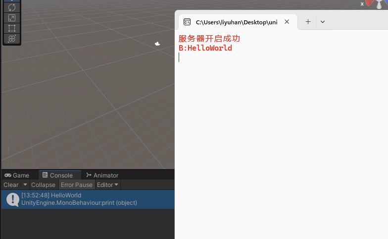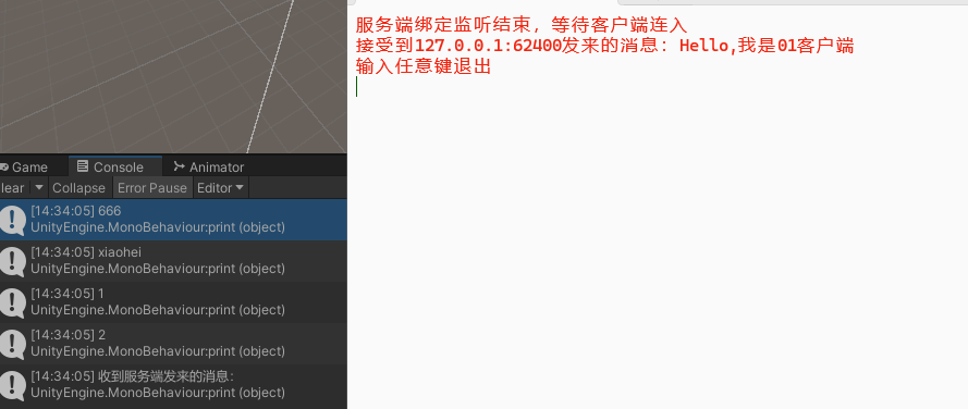 {// Start is called before the first frame updatevoid Start(){//1.创建套接字SocketSocket socket = new Socket(AddressFamily.InterNetwork,SocketType.Stream,ProtocolType.Tcp);//2.用Connect方法与服务端相连//确定服务端的IP和端口IPEndPoint iPEndPoint = new IPEndPoint(IPAddress.Parse("127.0.0.1"), 8080);try{socket.Connect(iPEndPoint);}catch (SocketException e){if (e.ErrorCode == 10061)print("服务器拒绝连接");elseprint("连接服务器失败" + e.ErrorCode);}//3.用Send和Receive相关方法收发数据//接受byte[] bytes = new byte[1024];int receiveNum = socket.Receive(bytes);print("收到服务端发来的消息:" + Encoding.UTF8.GetString(bytes,0,receiveNum));//发送socket.Send(Encoding.UTF8.GetBytes("Hello,我是01客户端"));//4.用ShutDown方法释放连接socket.Shutdown(SocketShutdown.Both);//5.关闭套接字socket.Close();