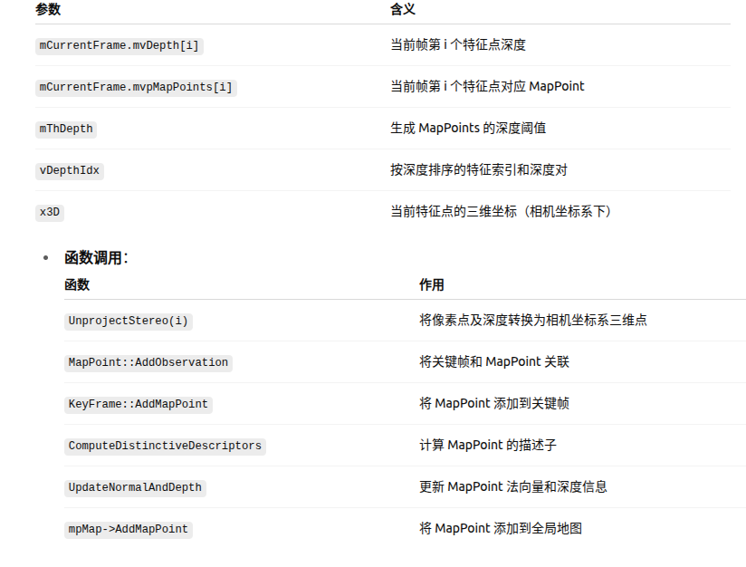 if(mSensor!=System::MONOCULAR){//更新当前帧的位姿矩阵,详见2.4.3.1mCurrentFrame.UpdatePoseMatrices();// We sort points by the measured depth by the stereo/RGBD sensor.// We create all those MapPoints whose depth < mThDepth.// If there are less than 100 close points we create the 100 closest.//按深度排序所有可用特征点vector<pair<float,int> > vDepthIdx;vDepthIdx.reserve(mCurrentFrame.N);for(int i=0; i<mCurrentFrame.N; i++){float z = mCurrentFrame.mvDepth[i];if(z>0){vDepthIdx.push_back(make_pair(z,i));}}if(!vDepthIdx.empty()){//按深度排序(近点优先)sort(vDepthIdx.begin(),vDepthIdx.end());int nPoints = 0;for(size_t j=0; j<vDepthIdx.size();j++){int i = vDepthIdx[j].second;bool bCreateNew = false;MapPoint* pMP = mCurrentFrame.mvpMapPoints[i];if(!pMP)bCreateNew = true;else if(pMP->Observations()<1){bCreateNew = true;mCurrentFrame.mvpMapPoints[i] = static_cast<MapPoint*>(NULL);}if(bCreateNew){//将当前帧第i个特征点反投影到世界坐标系,详见2.4.3.2cv::Mat x3D = mCurrentFrame.UnprojectStereo(i);MapPoint* pNewMP = new MapPoint(x3D,pKF,mpMap);//地图点被关键帧观测次数统计,详见2.4.3.3pNewMP->AddObservation(pKF,i);pKF->AddMapPoint(pNewMP,i);//寻找地图点最佳描述子 ,详见2.4.3.4pNewMP->ComputeDistinctiveDescriptors();//更新地图点法向量,可观测距离范围,详见2.4.3.5pNewMP->UpdateNormalAndDepth();mpMap->AddMapPoint(pNewMP);mCurrentFrame.mvpMapPoints[i]=pNewMP;nPoints++;}else{nPoints++;}if(vDepthIdx[j].first>mThDepth && nPoints>100)break;}}}