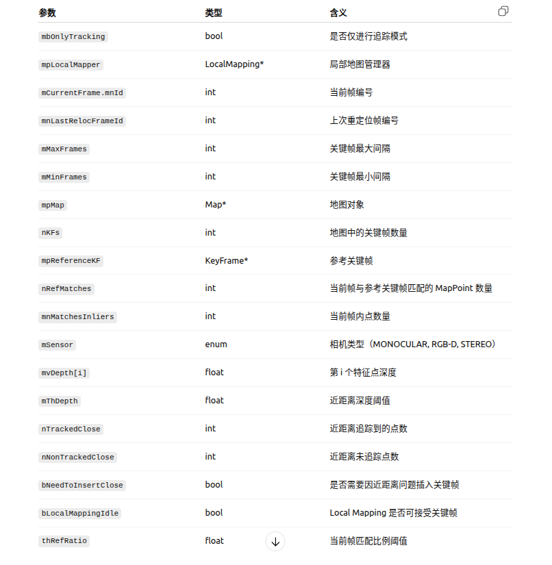 // Condition 1a: More than "MaxFrames" have passed from last keyframe insertionconst bool c1a = mCurrentFrame.mnId>=mnLastKeyFrameId+mMaxFrames;// Condition 1b: More than "MinFrames" have passed and Local Mapping is idle//bLocalMappingIdle:局部建图空闲const bool c1b = (mCurrentFrame.mnId>=mnLastKeyFrameId+mMinFrames && bLocalMappingIdle);//Condition 1c: tracking is weak//bNeedToInsertClose:近距离跟踪不佳const bool c1c = mSensor!=System::MONOCULAR && (mnMatchesInliers<nRefMatches*0.25 || bNeedToInsertClose) ;// Condition 2: Few tracked points compared to reference keyframe. Lots of visual odometry compared to map matches.//nRefMatches * thRefRatio:参考关键帧阀值比例const bool c2 = ((mnMatchesInliers<nRefMatches*thRefRatio|| bNeedToInsertClose) && mnMatchesInliers>15);