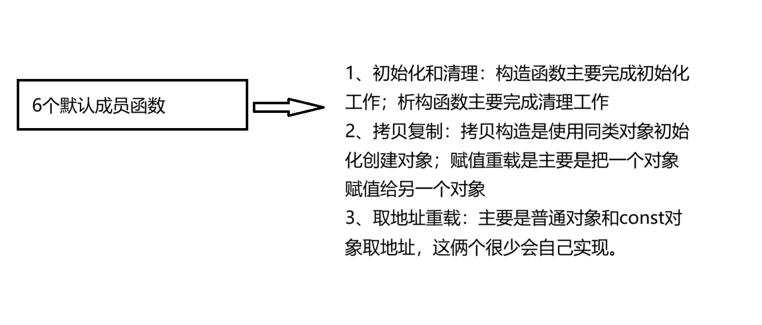 默认成员函数就是用户没有显式实现,编译器会自动生成的成员函数叫做默认成员函数。一个类,我们不写的情况下编译器会默认生成以下6个默认成员函数,需要注意的是这6个中最重要的是前4个,最后俩个取地址重载不重要,大家做个稍微地了解就可以了。
