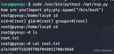 发现是可以执行代码的函数,直接利用python pty模块提权