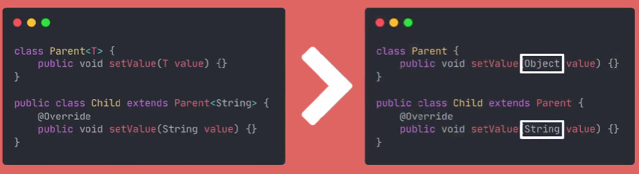 把泛型中的所有类型参数替换为 Object,如果指定类型边界,则使用类型边界来替换。因此,生成的字节码仅包含普通的类,接口和方法。