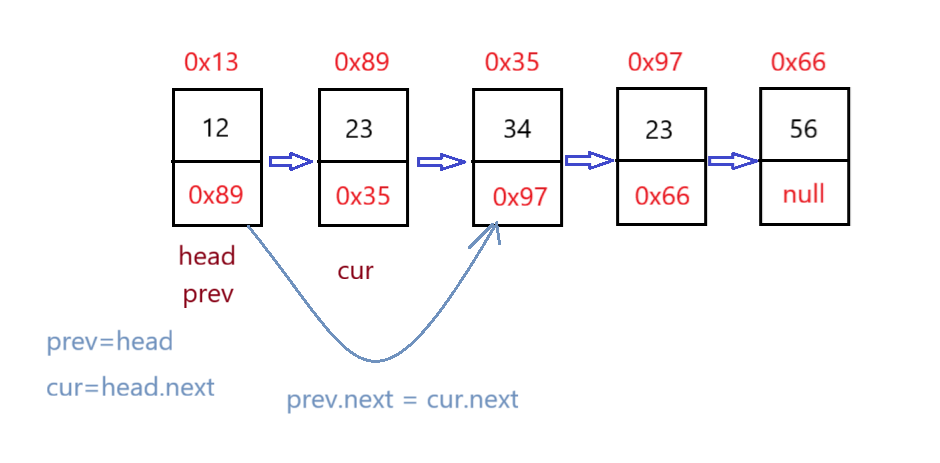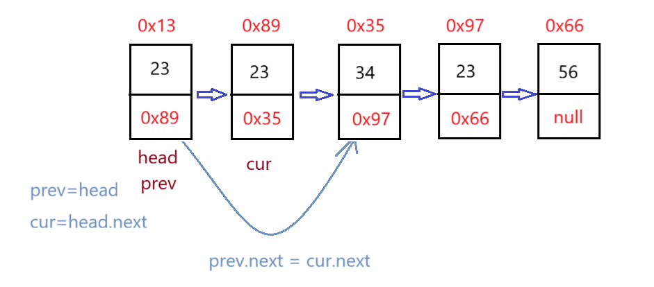 如果是非空情况:如下图,定义一个prev和cur引用,prev初始表示head的位置,cur初始表示head.next位置,遍历链表,如果cur节点的val值等于key,则删除节点——prev.next=cur.next;