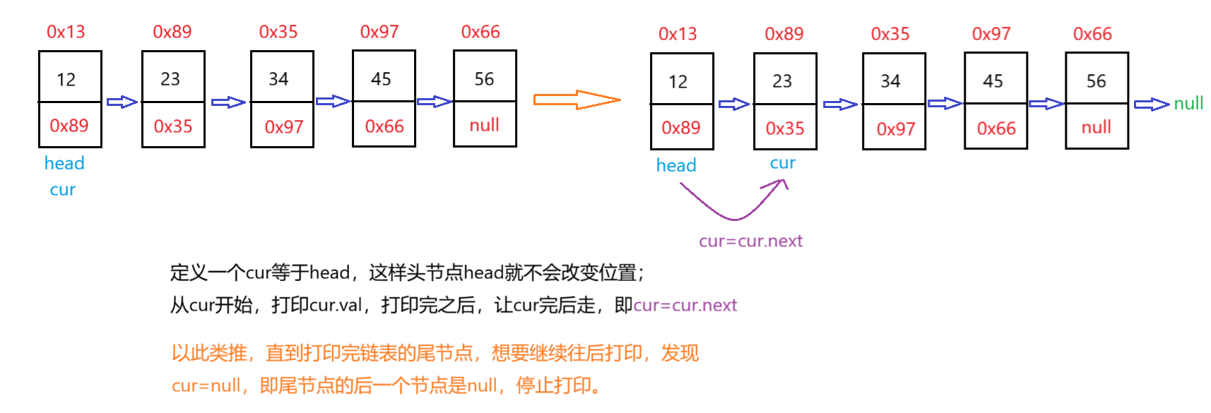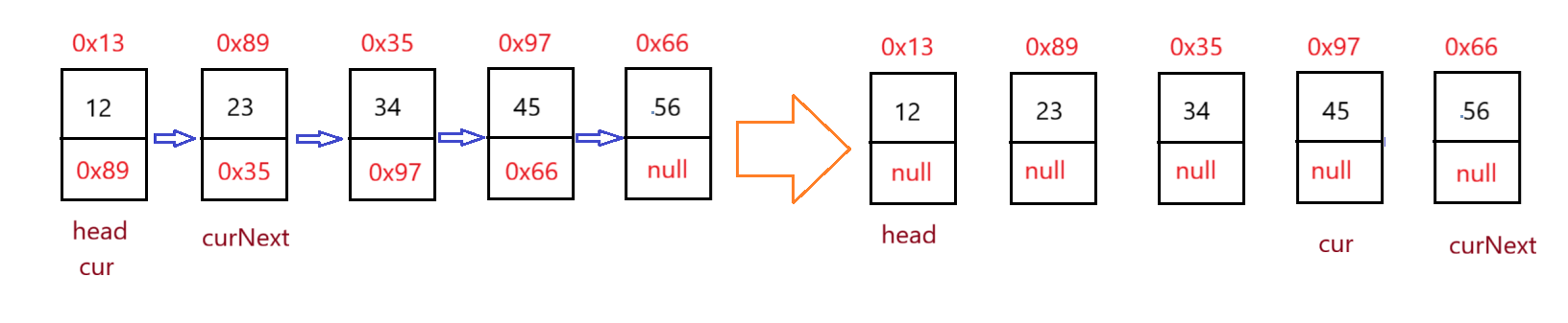 遍历链表,定义一个cur引用,它初始表示head,定义curNext,它初始表示head.next,即cur.next;