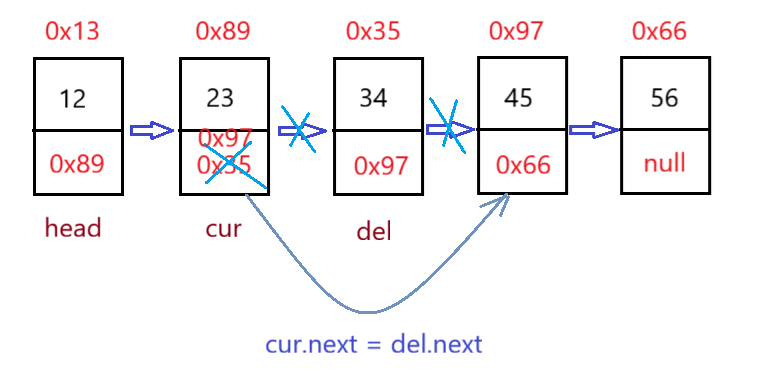 public void remove(int key) {//链表为空if(head == null) {return;}//非空ListNode cur = findNodeOfKey(key);if(cur == null) { //在findNodeOfKey方法中cur走到null,也就是说链表中没有你要删除的key值return;}//链表中有要删除的key值,删除该值所在的节点ListNode del = cur.next;//del节点是cur的下一个节点cur.next = del.next;//删除