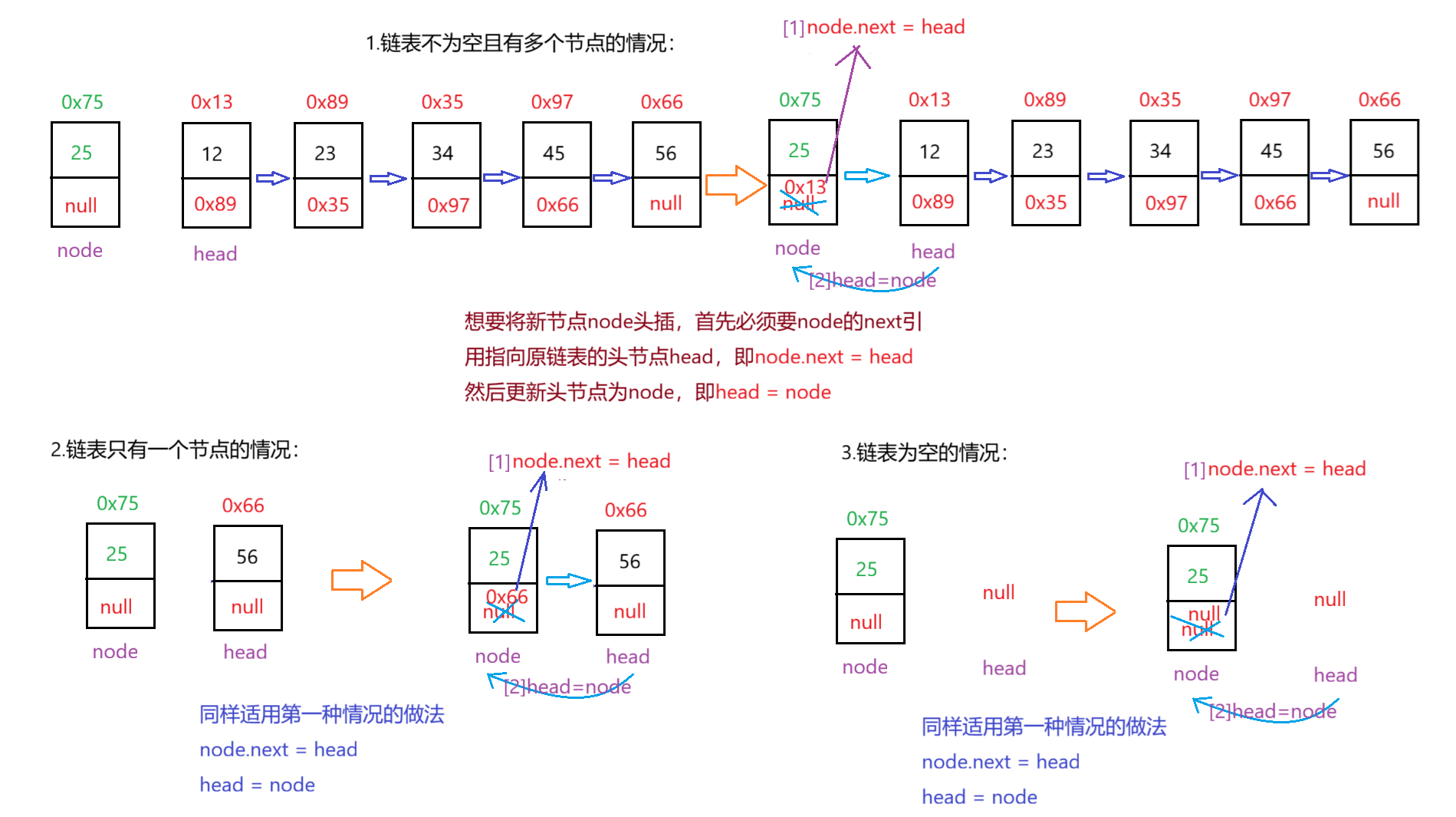如上图,列出了头插中的三种情况,也可以说是两种情况:为空和不为空。