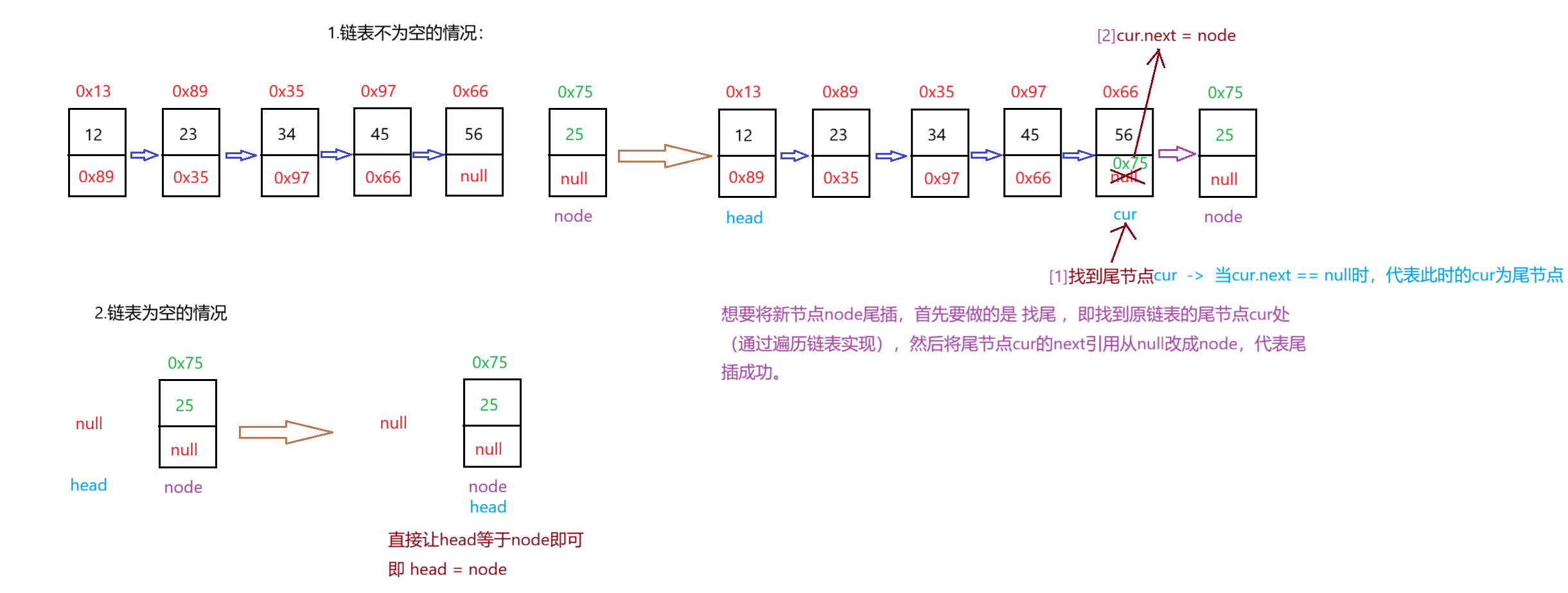 public void addLast(int date) {ListNode node = new ListNode(date);//链表为空if(head == null) {head = node;return;}//不为空//找尾ListNode cur = head;while(cur.next != null) {cur = cur.next;}//此时的cur就是尾节点cur.next = node;//更新node为新的尾节点