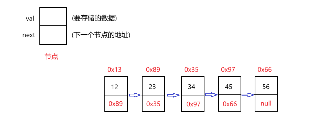 在Java中,没有指针,也没有结构体,Java中使用内部类来代替(通常是静态内部类),即每一个节点是一个内部类类型,其中next是一个该内部类类型,即为引用类型。
